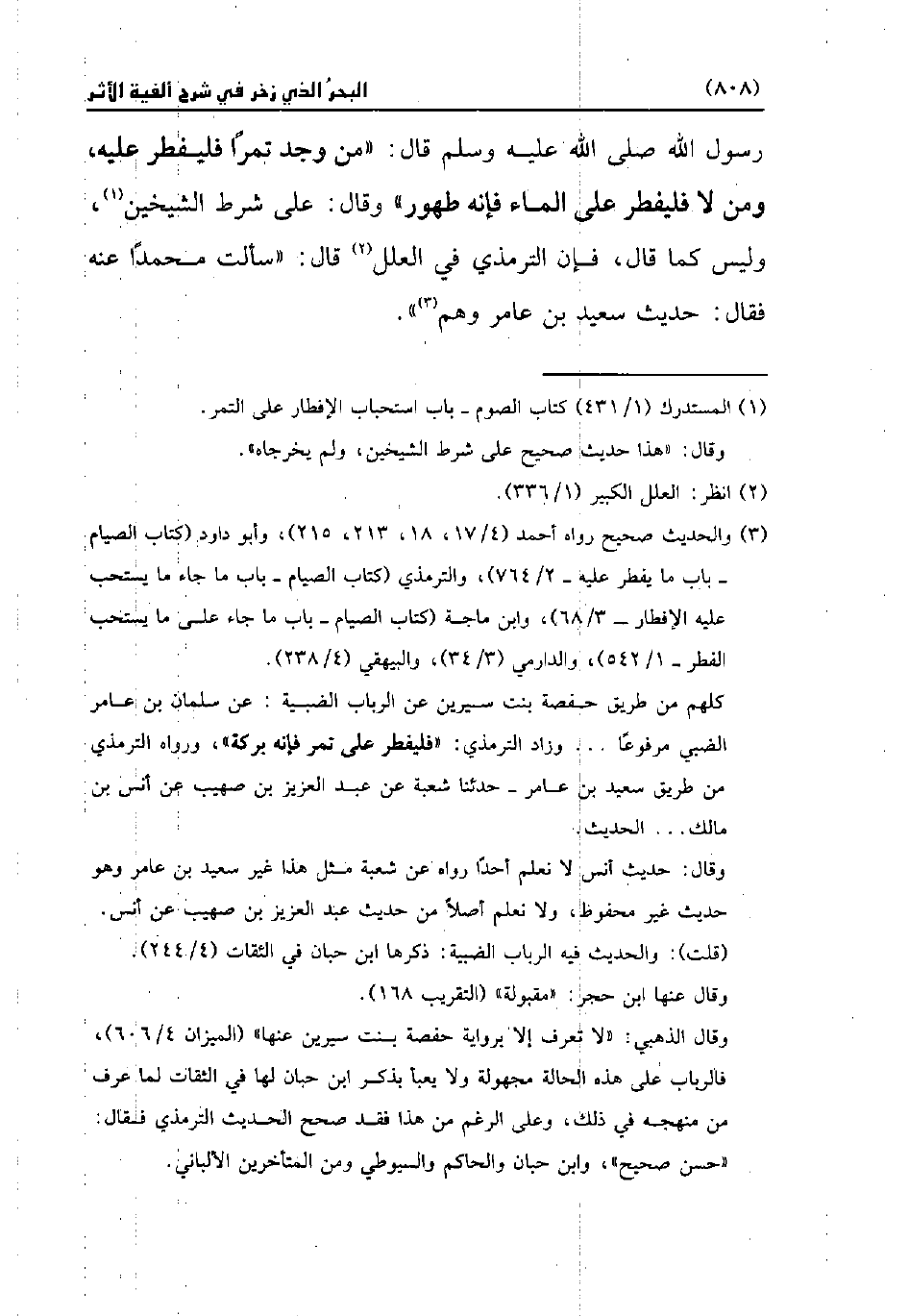 رسول اللَّه صلى اللَّه عليه وسلم قال: "من وجد تمرًا فليفطر عليه، ومن لا فليفطر على الماء فإنه طهور" وقال: على شرط الشيخين (¬1)، وليس كما قال، فإن الترمذي في العلل (¬2) قال: "سألت محمدًا عنه فقال: حديث سعيد بن عامر وهم (¬3) ".