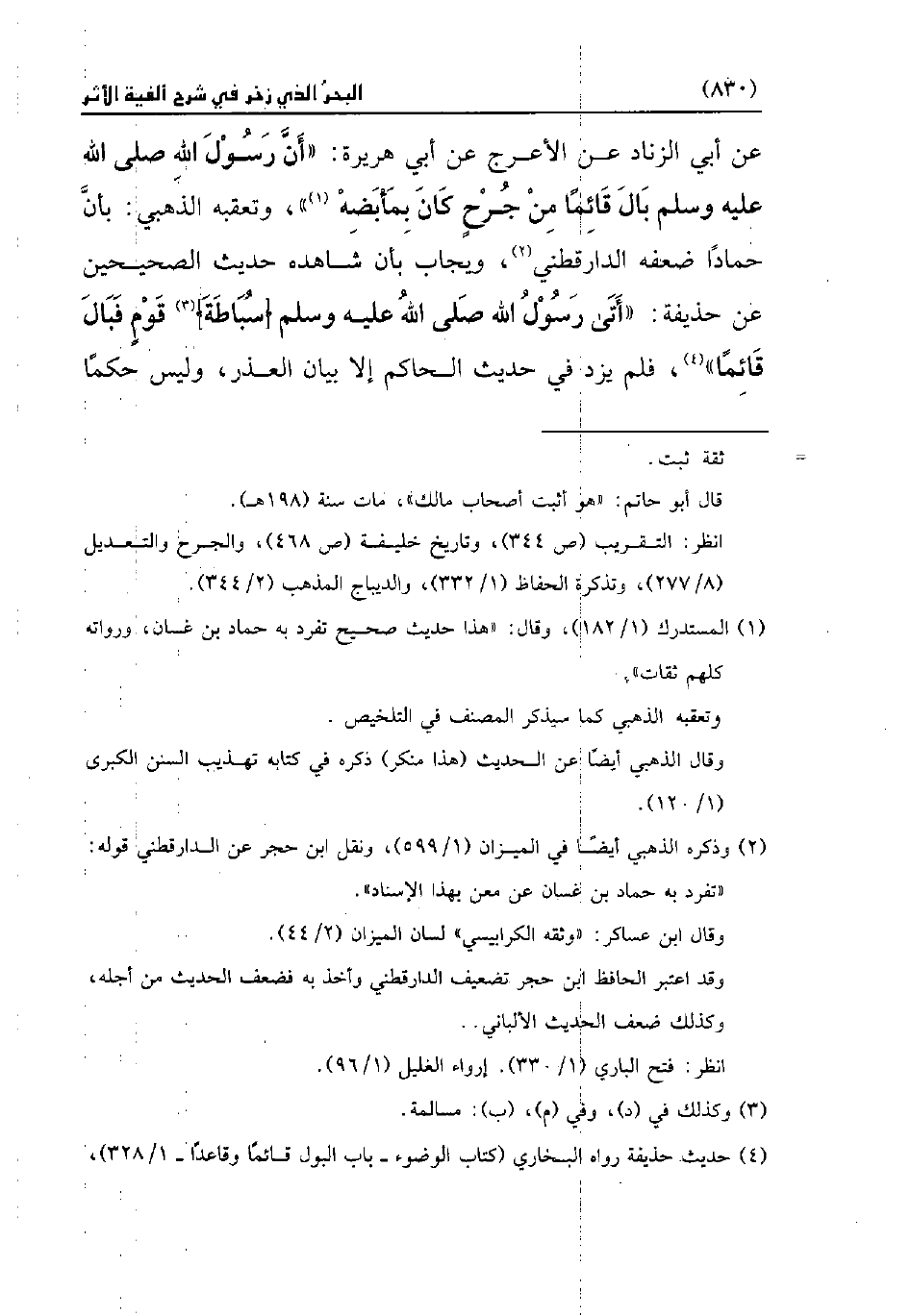 عن أبي الزناد عن الأعرج عن أبي هريرة: "أَنَّ رَسُوْلَ اللَّهِ صلى اللَّه عليه وسلم بَالَ قَائِمًا مِن جُرْحٍ كَانَ بِمَأَبَضِهْ (¬1) "، وتعقبه الذهبي: بأنَّ حمادًا ضعفه الدارقطني (¬2)، ويجاب بأن شاهده حديث الصحيحين عن حذيفة: "أَتَى رَسُوْلُ اللَّه صَلى اللَّهُ عليه وسلم [سُبَاطَةَ] (¬3) قَوْمٍ فَبَالَ قَائِمًا" (¬4)، فلم يزد في حديث الحاكم إلا بيان العذر، وليس حكمًا