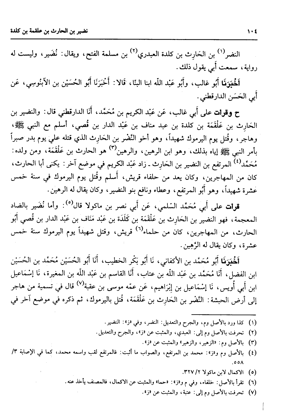 النضر (1) بن الحارث بن كلدة العبدري (2) بن مسلمة الفتح ويقال نضير وليست له رواية سمعت أبي يقول ذلك أخبرنا أبو غالب وأبو عبد الله ابنا البنا قالا أخبرنا أبو الحسين بن الآبنوسي عن أبي الحسن الدارقطني ح وقرأت على أبي غالب عن عبد الكريم بن محمد أنا الدارقطني قال والنضير بن الحارث بن علقمة بن كلدة بن عبد مناف بن عبد الدار بن قصي أسلم مع النبي (صلى الله عليه وسلم) وهاجر وقتل يوم اليرموك شهيدا وهو أخو النضر بن الحارث الذي قتله علي يوم بدر صبرا بأمر النبي (صلى الله عليه وسلم) إياه بذلك وهو ابن الرهين والرهين (3) هو الحارث بن علقمة ومن ولده محمد (4) المرتفع بن النضير بن الحارث زاد عبد الكريم في موضع آخر يكنى أبا الحارث كان من المهاجرين وكان يعد من حلفاء قريش أسلم وقتل يوم اليرموك في سنة خمس عشرة شهيدا وهو أبو المرتفع وعطاء ونافع بنو النضير وكان يقال له الرهين قرأت على أبي محمد السلمي عن أبي نصر بن ماكولا (5) قال وأما نضير بالضاد المعجمة فهو النضير بن الحارث بن علقمة بن كلدة بن عبد مناف بن عبد الدار بن قصي أبو الحارث من المهاجرين كان من حلماء (6) قريش وقتل شهيدا يوم اليرموك سنة خمس عشرة وكان يقال له الرهين أخبرنا أبو محمد بن الأكفاني نا أبو بكر الخطيب أنا أبو الحسين محمد بن الحسين
