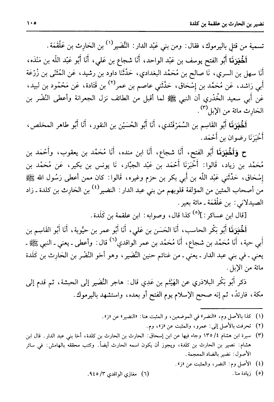 تسمية من قتل باليرموك فقال ومن بني عبد الدار النضير (1) بن الحارث بن علقمة أخبرنا أبو الفتح يوسف بن عبد الواحد أنا شجاع بن علي أنا أبو عبد الله بن منده أنا سهل بن السري نا صالح بن محمد البغدادي حدثنا داود بن رشيد عن المثنى بن زرعة أبي راشد عن محمد بن إسحاق حدثني عاصم بن عمر (2) بن قتادة عن محمود بن لبيد عن أبي سعيد الخدري أن النبي (صلى الله عليه وسلم) لما أقبل من الطائف نزل الجعرانة وأعطى النضر بن الحارث مائة من الأبل (3) أخبرنا أبو القاسم بن السمرقندي أنا أبو الحسين بن النقور أنا أبو طاهر المخلص أخبرنا رضوان بن أحمد ح وأخبرنا أبو الفتح أنا شجاع أنا ابن منده أنا محمد بن يعقوب وأحمد بن محمد بن زياد قالوا أخبرنا أحمد بن عبد الجبار نا يونس بن بكير عن محمد بن إسحاق حدثني عبد الله بن أبي بكر بن حزم وغيره قالوا كان ممن أعطى رسول الله (صلى الله عليه وسلم) من أصحاب المئين من المؤلفة قلوبهم من بني عبد الدار النضير (4) بن الحارث بن كلدة زاد الصيدلاني بن علقمة مائة بعير قال ابن عساكر (5) كذا قال وصوابه ابن علقمة بن كلدة أخبرنا أبو بكر الحاسب أنا الحسن بن علي أنا أبو عمر بن حيوية أنا أبو القاسم بن أبي حية أنا محمد بن شجاع أنا محمد بن عمر الواقدي (6) قال واعطى يعني النبي (صلى الله عليه وسلم) يعني في بني عبد الدار يعني من غنائم حنين النضير وهو أخو النضر بن الحارث بن كلدة مائة من الإبل ذكر أبو بكر البلاذري عن الهيثم بن عدي قال هاجر النضير إلى الحبشة ثم قدم إلى مكة فارتد ثم إنه صحح الإسلام يوم الفتح أو بعده واستشهد باليرموك