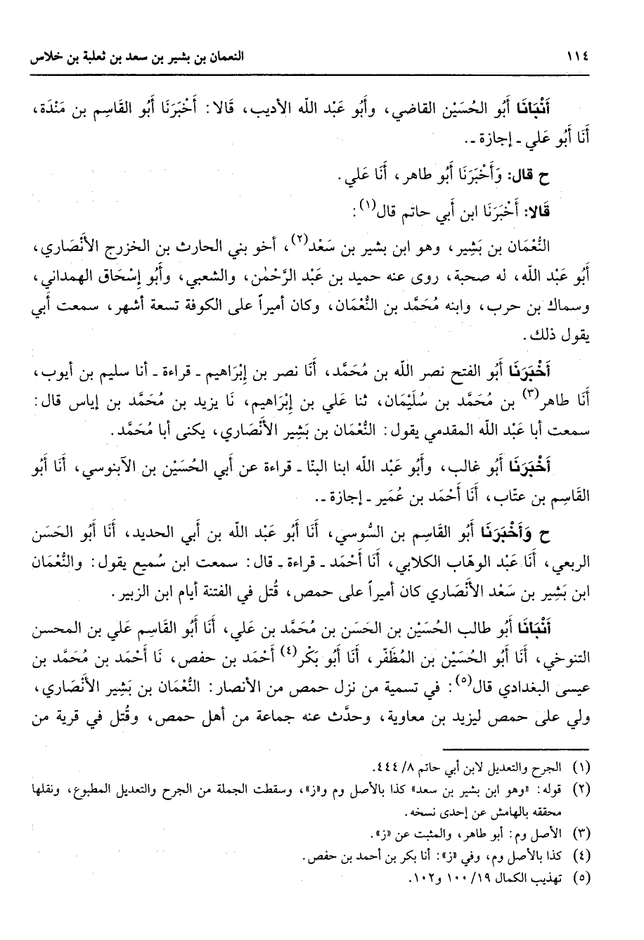 أنبأنا أبو الحسين القاضي وأبو عبد الله الأديب قالا أخبرنا أبو القاسم بن مندة أنا أبو علي إجازة ح قال وأخبرنا أبو طاهر أنا علي قالا أخبرنا ابن أبي حاتم قال (1) النعمان بن بشير وهو ابن بشير بن سعد (2) أخو بني الحارث بن الخزرج الأنصاري أبو عبد الله له صحبة روى عنه حميد بن عبد الرحمن والشعبي وأبو إسحاق الهمداني وسماك بن حرب وابنه محمد بن النعمان وكان أميرا على الكوفة تسعة أشهر سمعت أبي يقول ذلك أخبرنا أبو الفتح نصر الله بن محمد أنا نصر بن إبراهيم قراءة أنا سليم بن أيوب أنا طاهر (3) بن محمد بن سليمان ثنا علي بن إبراهيم نا يزيد بن محمد بن إياس قال سمعت أبا عبد الله المقدمي يقول النعمان بن بشير الأنصاري يكنى أبا محمد أخبرنا أبو غالب وأبو عبد الله ابنا البنا قراءة عن أبي الحسين بن الآبنوسي أنا أبو القاسم بن عتاب أنا احمد بن عمير إجازة ح وأخبرنا أبو القاسم بن السوسي أنا أبو عبد الله بن أبي الحديد أنا أبو الحسن الربعي أنا عبد الوهاب الكلابي أنا احمد قراءة قال سمعت ابن سميع يقول والنعمان ابن بشير بن سعد الأنصاري كان أميرا على حمص قتل في الفتنة أيام ابن الزبير أنبأنا أبو طالب الحسين بن الحسن بن محمد بن علي أنا أبو القاسم علي بن المحسن التنوخي أنا أبو الحسين بن المظفر أنا أبو بكر (4) أحمد بن حفص نا أحمد بن محمد بن عيسى البغدادي قال (5) في تسمية من نزل حمص من الأنصار النعمان بن بشير الأنصاري ولي على حمص ليزيد بن معاوية وحدث عنه جماعة من أهل حمص وقتل في قرية من