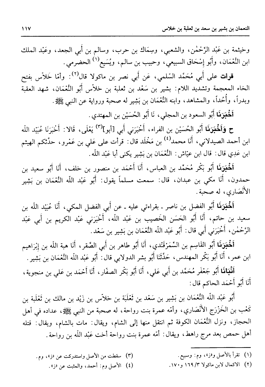 وخيثمة بن عبد الرحمن والشعبي وسماك بن حرب وسالم بن ابي الجعد وعبد الملك ابن النعمان وأبو إسحاق السبيعي وحبيب بن سالم ويسيع (1) الحضرمي قرأت على أبي محمد السلمي عن أبي نصر بن ماكولا قال (2) وأما خلاس بفتح الخاء المعجمة وتشديد اللام بشير بن سعد بن ثعلبة بن خلاس أبو النعمان شهد العقبة وبدر أو أحدا والمشاهد وابنه النعمان بن بشير له صحبة ورواية عن النبي (صلى الله عليه وسلم) أخبرنا أبو السعود بن المجلي نا أبو الحسين بن المهتدي ح وأخبرنا أبو الحسين بن الفراء أخبرني أبي أبو (3) يعلى قالا أخبرنا عبيد الله ابن أحمد الصيدلاني أنا محمد (4) بن مخلد قال قرأت على علي بن عمرو حدثكم الهيثم ابن عدي قال قال ابن عياش النعمان بن بشير يكنى أبا عبد الله أخبرنا أبو بكر محمد بن العباس أنا أحمد بن منصور بن خلف أنا أبو سعيد بن حمدون أنا مكي بن عبدان قال سمعت مسلما يقول أبو عبد الله النعمان بن بشير الأنصاري له صحبة أخبرنا أبو الفضل بن ناصر بقراءتي عليه عن أبي الفضل المكي أنا عبيد الله بن سعيد بن حاتم أنا أبو الحسن الخصيب بن عبد الله أخبرني عبد الكريم بن أبي عبد الرحمن أخبرني أبي قال أبو عبد الله النعمان بن بشير بن سعد أخبرنا أبو القاسم بن السمرقندي أنا أبو طاهر بن أبي الصقر أنا هبة الله بن إبراهيم ابن عمر أنا أبو بكر المهندس حدثنا أبو بشر الدولابي قال أبو عبد الله النعمان بن بشير أنبأنا أبو جعفر محمد بن أبي علي أنا أبو بكر الصفار أنا أحمد بن علي بن منجوية أنا أبو أحمد الحاكم قال أبو عبد الله النعمان بن بشير بن سعد بن ثعلبة بن خلاس بن زيد بن مالك بن ثعلبة بن كعب بن الخزرج الأنصاري وأمه عمرة بنت رواحة له صحبة من النبي (صلى الله عليه وسلم) عداده في أهل الحجاز ونزل النعمان الكوفة ثم انتقل منها إلى الشام ويقال مات بالشام ويقال قتله أهل حمص بعد مرج راهط ويقال أمه عمرة بنت رواحة أخت عبد الله بن رواحة