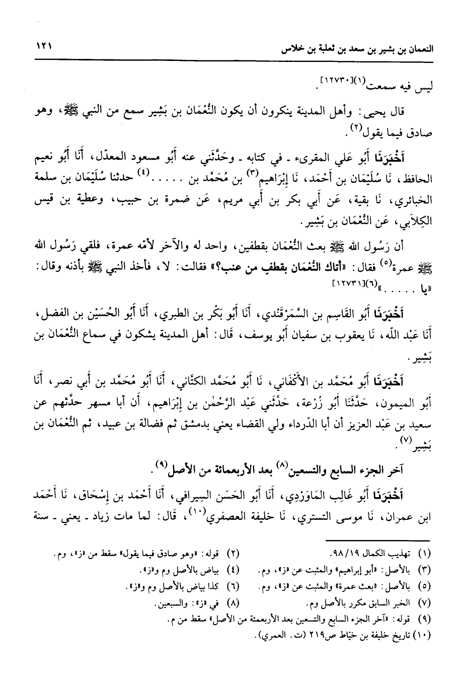 ليس فيه سمعت (1) قال يحيى وأهل المدينة ينكرون أن يكون النعمان بن بشير سمع من النبي (صلى الله عليه وسلم) وهو صادق فيما يقول (2) أخبرنا أبو علي المقرئ في كتابه وحدثني عنه أبو مسعود المعدل أنا أبو نعيم الحافظ نا سليمان بن أحمد نا إبراهيم (3) بن محمد بن حدثنا (4) سليمان بن سلمة الخبائري نا بقية عن أبي بكر بن أبي مريم عن ضمرة بن حبيب وعطية بن قيس الكلابي عن النعمان بن بشير أن رسول الله (صلى الله عليه وسلم) بعث النعمان بقطفين واحد له والآخر لأمه عمرة فلقي رسول الله (صلى الله عليه وسلم) عمرة (5) فقال أتاك النعمان بقطف من عنب فقالت لا فأخذ النبي (صلى الله عليه وسلم) بأذنه وقال يا (6) أخبرنا أبو القاسم بن السمرقندي أنا أبو بكر بن الطبري أنا أبو الحسين بن الفضل أنا عبد الله نا يعقوب بن سفيان أبو يوسف قال أهل المدينة يشكون في سماع النعمان بن بشير (7) أخبرنا أبو محمد بن الأكفاني نا أبو محمد الكتاني أنا أبو محمد بن أبي نصر أنا أبو الميمون حدثنا أبو زرعة حدثني عبد الرحمن بن إبراهيم أن أبا مسهر حدثهم عن سعيد بن عبد العزيز أن ابا الدرداء ولي القضاء يعني بدمشق ثم فضالة بن عبيد ثم النعمان بن بشير آخر الجزء السابع والتسعين (8) بعد الأربعمائة من الأصل (9) أخبرنا أبو غالب الماوردي أنا أبو الحسن السيرافي أنا أحمد ن إسحاق نا أحمد ابن عمران نا موسى التستري نا خليفة العصفري (10) قال لما مات زياد يعني سنة