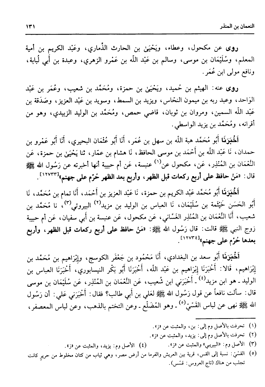 روى عن مكحول وعطاء ويحيى بن الحارث الذماري وعبد الكريم بن أمية المعلم وسليمان بن موسى وسالم بن عبد الله بن عمرو الزهري وعبدة بن أبي لبابة ونافع مولى ابن عمر روى عنه الهيثم بن حميد ويحيى بن حمزة ومحمد بن شعيب وعمر بن عبد الواحد وعبد ربه بن ميمون النحاس ويزيد بن السمط وسويد بن عبد العزيز وصدقة بن عبد الله السمين ومروان بن ثوبان قاضي حمص ومحمد بن الوليد الزبيدي وهو من أقرانه ومحمد بن يزيد الواسطي أخبرنا أبو محمد هبة الله بن سهل بن عمر أنا أبو عثمان البحتري أنا أبو عمرو بن حمدان نا عبد الله بن احمد بن موسى الحافظ نا هشام بن عمار ثنا يحيى بن حمزة عن النعمان بن المنذر عن مكحول عن (1) عنبسة عن أم حبيبة أنها أخبرته عن رسول الله (صلى الله عليه وسلم) قال من حافظ على أربع ركعات قبل الظهر وأربع بعد الظهر حرم على جهنم أخبرنا أبو محمد عبد الكريم بن حمزة نا عبد العزيز بن أحمد أنا تمام بن محمد نا أبو الحسن خيثمة بن سليمان نا العباس بن الوليد بن مزيد (2) البيروتي (3) نا محمد بن شعيب أنا النعمان بن المنذر الغساني عن مكحول عن عنبسة بن أبي سفيان عن أم حبيبة زوج النبي (صلى الله عليه وسلم) قالت قال رسول الله (صلى الله عليه وسلم) من حافظ على أربع ركعات قبل الظهر وأربع بعدها حرم على جهنم أخبرنا أبو سعد بن البغدادي أنا محمود بن جعفر الكوسج وإبراهيم بن محمد بن إبراهيم قالا أخبرنا إبراهيم بن عبد الله أخبرنا أبو بكر النيسابوري أخبرنا العباس بن الوليد هو ابن مزيد (4) أخبرني ابن شعيب عن النعمان بن المنذر عن سليمان بن موسى قال سألت نافعا عن قول رسول الله (صلى الله عليه وسلم) لعلي بن أبي طالب فقال أخبرني علي أن رسول الله (صلى الله عليه وسلم) نهى عن لباس القسي (5) وهو المضلع وعن التختم بالذهب وعن لباس المعصفر