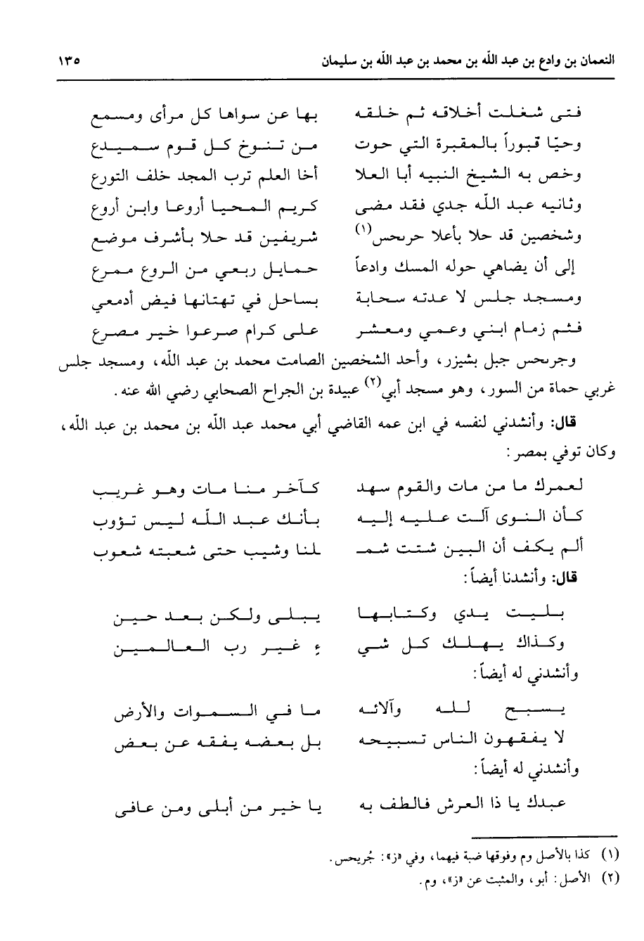 فتى شغلت أخلاقه ثم خلقه * بها عن سواها كل مرأى ومسمع وحيا قبورا بالمقبرة التي حوت * من تنوخ كل قوم سميدع وخص به الشيخ النبيه أبا العلا * أخا العلم ترب المجد خلف التورع وثانيه عبد الله جدي فقد مضى * كريم المحيا أروعا وابن أروع وشخصين قد حلا بأعلا حريحس (1) * شريفين قد حلا بأشرف موضع إلى أن يضاهى حوله المسك وادعا * حمايل ربعي من الروع ممرع ومسجد جلس لا عدته سحابة * بساحل في تهتانها فيض أدمعي فثم زمام ابني وعمي ومعشر * على كرام صرعوا خير مصرع * وجريحس جبل بشيزر وأحد الشخصين الصامت محمد بن عبد الله ومسجد جلس غربي حماة من السور وهو مسجد أبي (2) عبيدة بن الجراح الصحابي Bهـ قال وأنشدني لنفسه في ابن عمه القاضي أبي محمد عبد الله بن محمد بن عبد الله وكان توفي بمصر لعمرك ما من مات والقوم سهد * كآخر منا مات وهو غريب كأن النوى آلت عليه إليه * بأنك عبد الله ليس تؤوب ألم يكف أن البين شتت شم * لنا وشيب حتى شعبته شعوب * قال وأنشدنا أيضا بليت يدي وكتابها * يبلى ولكن بعد حين وكذاك يهلك كل شي * ء غير رب العالمين * وأنشدني له أيضا يسبح لله وآلائه * ما في السموات والأرض لا يفقهون الناس تسبيحه * بل بعضه يفقه عن بعض * وأنشدني له أيضا عبدك يا ذا العرش فالطف به * يا خير من أبلى ومن عافى