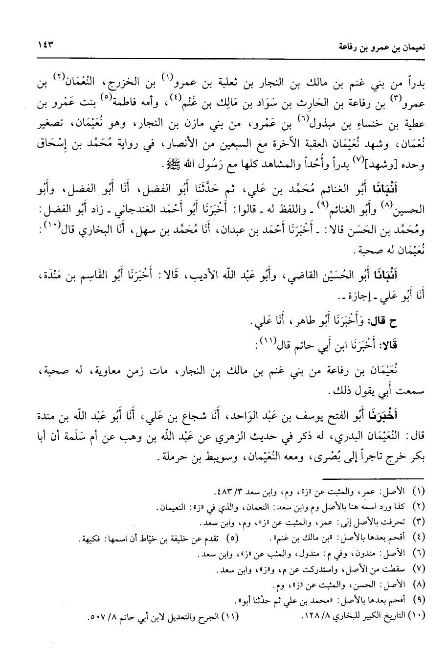 بدرا من بني غنم بن مالك بن النجار بن ثعلبة بن عمرو (1) بن الخزرج النعمان بن (2) عمرو (3) بن رفاعة بن الحارث بن سواد بن مالك بن غنم (4) وأمه فاطمة (5) بنت عمرو بن عطية بن خنساء بن مبذول (6) بن عمرو من بن ي مازن بن النجار وهو نعيمان تصغير نعمان وشهد نعيمان العقبة الآخرة مع السبعين من الأنصار في رواية محمد بن إسحاق وحده وشهد (7) بدرا وأحدا والمشاهد كلها مع رسول الله (صلى الله عليه وسلم) أنبأنا أبو الغنائم محمد بن علي ثم حدثنا أبو الفضل أنا أبو الفضل وأبو الحسين (8) وأبو الغنائم (9) واللفظ له قالوا أخبرنا أبو أحمد الغندجاني زاد أبو الفضل ومحمد بن الحسن قالا أخبرنا أحمد بن عبدان أنا محمد بن سهل أنا البخاري قال (10) نعيمان له صحبة أنبأنا أبو الحسين القاضي وأبو عبد الله الأديب قالا أخبرنا أبو القاسم بن مندة أنا أبو علي إجازة ح وقال وأخبرنا أبو طاهر أنا علي قالا أخبرنا ابن أبي حاتم قال (11) نعيمان بن رفاعة من بني غنم بن مالك بن النجار مات زمن معاوية له صحبة سمعت أبي يقول ذلك أخبرنا أبو الفتح يوسف بن عبد الواحد أنا شجاع بن علي أنا أبو عبد الله بن مندة قال النعيمان البدري له ذكر في حديث الزهري عن عبد الله بن وهب عن أم سلمة أن أبا بكر خرج تاجرا إلى بصرى ومعه النعيمان وسويبط بن حرملة