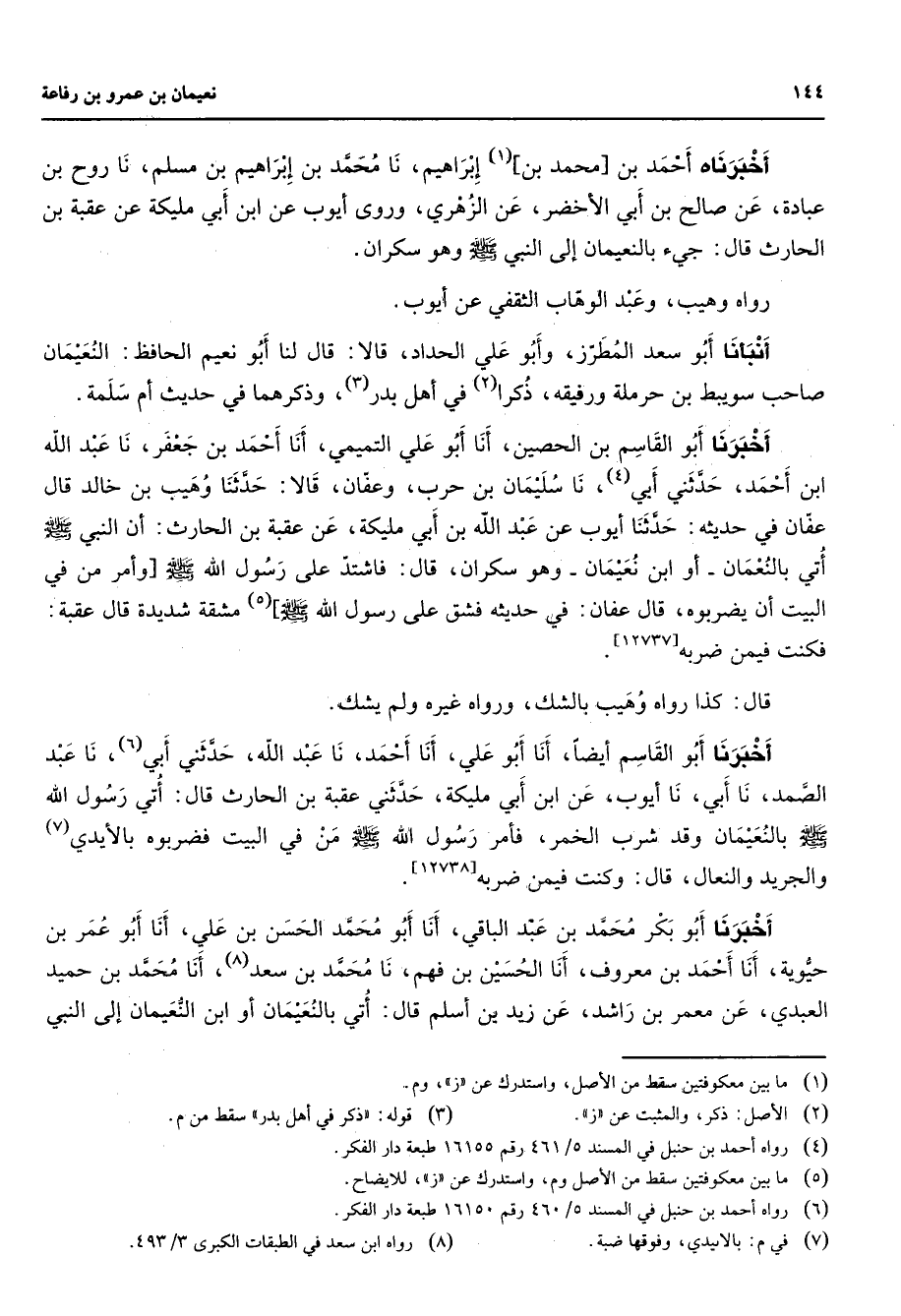 أخبرناه أحمد بن محمد بن (1) إبراهيم نا محمد بن إبراهيم بن مسلم نا روح بن عبادة عن صالح بن أبي الأخضر عن الزهري وروى أيوب عن ابن أبي مليكة عن عقبة بن الحارث قال جئ بالنعيمان إلى النبي (صلى الله عليه وسلم) وهو سكران رواه وهيب وعبد الوهاب الثقفي عن أيوب أنبأنا أبو سعد المطرز وأبو علي الحداد قالا قال لنا أبو نعيم الحافظ النعيمان صاحب سويبط بن حرملة ورفيقه ذكرا (2) في أهل بدر (3) وذكرهما في حديث أم سلمة أخبرنا أبو القاسم بن الحصين أنا أبو علي التميمي أنا أحمد بن جعفر نا عبد الله ابن أحمد حدثني أبي (4) نا سليمان بن حرب وعفان قالا حدثنا وهيب بن خالد قال عفان في حديثه حدثنا أيوب عن عبد الله بن أبي مليكة عن عقبة بن الحارث أن النبي (صلى الله عليه وسلم) أتى بالنعمان أو ابن نعيمان وهو سكران قال فاشتد على رسول الله (صلى الله عليه وسلم) وأمر من في البيت أن يضربوه قال عفان في حديثه فشق على رسول الله (صلى الله عليه وسلم) (5) مشقة شديدة قال عقبة فكنت فيمن ضربه قال كذا رواه وهيب بالشك ورواه غيره ولم يشك أخبرنا أبو القاسم أيضا أنا أبو علي أنا أحمد نا عبد الله حدثني أبي (6) نا عبد الصمد نا أبي نا أيوب عن ابن أبي مليكة حدثني عقبة بن الحارث قال أتي رسول الله (صلى الله عليه وسلم) بالنعيمان وقد شرب الخمر فأمر رسول الله (صلى الله عليه وسلم) من في البيت فضربوه بالأيدي (7) والجريد والنعال قال وكنت فيمن ضربه أخبرنا أبو بكر محمد بن عبد الباقي أنا أبو محمد الحسن بن علي أنا أبو عمر بن حيوية أنا أحمد بن معروف أنا الحسين بن فهم نا محمد بن سعد (8) أنا محمد بن حميد العبدي عن معمر بن راشد عن زيد بن أسلم قال أتي بالنعيمان أو ابن النعيمان إلى النبي