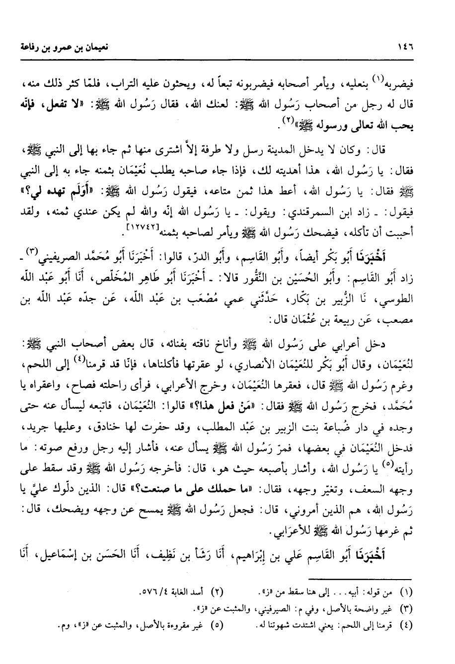 فيضربه (1) بنعليه ويأمر أصحابه فيضربونه تبعا له ويحثون عليه التراب فلما كثر ذلك منه قال له رجل من أصحاب رسول الله (صلى الله عليه وسلم) لعنك الله فقال رسول الله (صلى الله عليه وسلم) لا تفعل فإنه يحب الله تعالى ورسوله (صلى الله عليه وسلم) (2) قال وكان لا يدخل المدينة رسل ولا طرفة إلا اشترى منها ثم جاء بها إلى النبي (صلى الله عليه وسلم) فقال يا رسول الله هذا أهديته لك فإذا جاء صاحبه يطلب نعيمان بثمنه جاء به إلى النبي (صلى الله عليه وسلم) فقال يا رسول الله أعط هذا ثمن متاعه فيقول رسول الله (صلى الله عليه وسلم) أولم تهده لي فيقول زاد ابن السمرقندي ويقول يا رسول الله إنه والله لم يكن عندي ثمنه ولقد أحببت أن تأكله فيضحك رسول الله (صلى الله عليه وسلم) ويأمر لصاحبه بثمنهح أخبرنا أبو بكر أيضا وأبو القاسم وابو الدر قالوا أخبرنا أبو محمد الصريفيني (3) زاد أبو القاسم وأبو الحسين بن النقور قالا أخبرنا أبو طاهر المخلص أنا أبو عبد الله الطوسي نا الزبير بن بكار حدثني عمي مصعب بن عبد الله عن جده عبد الله بن مصعب عن ربيعة بن عثمان قال دخل أعرابي على رسول الله (صلى الله عليه وسلم) وأناخ ناقته بفنائه قال بعض أصحاب النبي (صلى الله عليه وسلم) لنعيمان وقال أبو بكر للنعيمان الأنصاري لو عقرتها فأكلناها فإنا قد قرمنا (4) إلى اللحم وغرم رسول الله (صلى الله عليه وسلم) قال فعقرها النعيمان وخرح الأعرابي فرأى راحلته فصاح واعقراه يا محمد فخرج رسول الله (صلى الله عليه وسلم) فقال من فعل هذا قالوا النعيمان فاتبعه ليسأل عنه حتى وجده في دار ضباعة بنت الزبير بن عبد المطلب وقد حفرت لها خنادق وعليها جريد فدخل النعيمان في بعضها فمر رسول الله (صلى الله عليه وسلم) يسأل عنه فأشار إليه رجل ورفع صوته ما رأيته (5) يا رسول الله وأشار بأصبعه حيث هو قال فأخرجه رسول الله (صلى الله عليه وسلم) وقد سقط على وجهه السعف وتغير وجهه فقال ما حملك على ما صنعت قال الذين دلوك علي يا رسول الله هم الذين أمروني قال فجعل رسول الله (صلى الله عليه وسلم) يمسح عن وجهه ويضحك قال ثم غرمها رسول الله (صلى الله عليه وسلم) للأعرابي أخبرنا أبو القاسم علي بن إبراهيم أنا رشأ بن نظيف أنا الحسن بن إسماعيل أنا