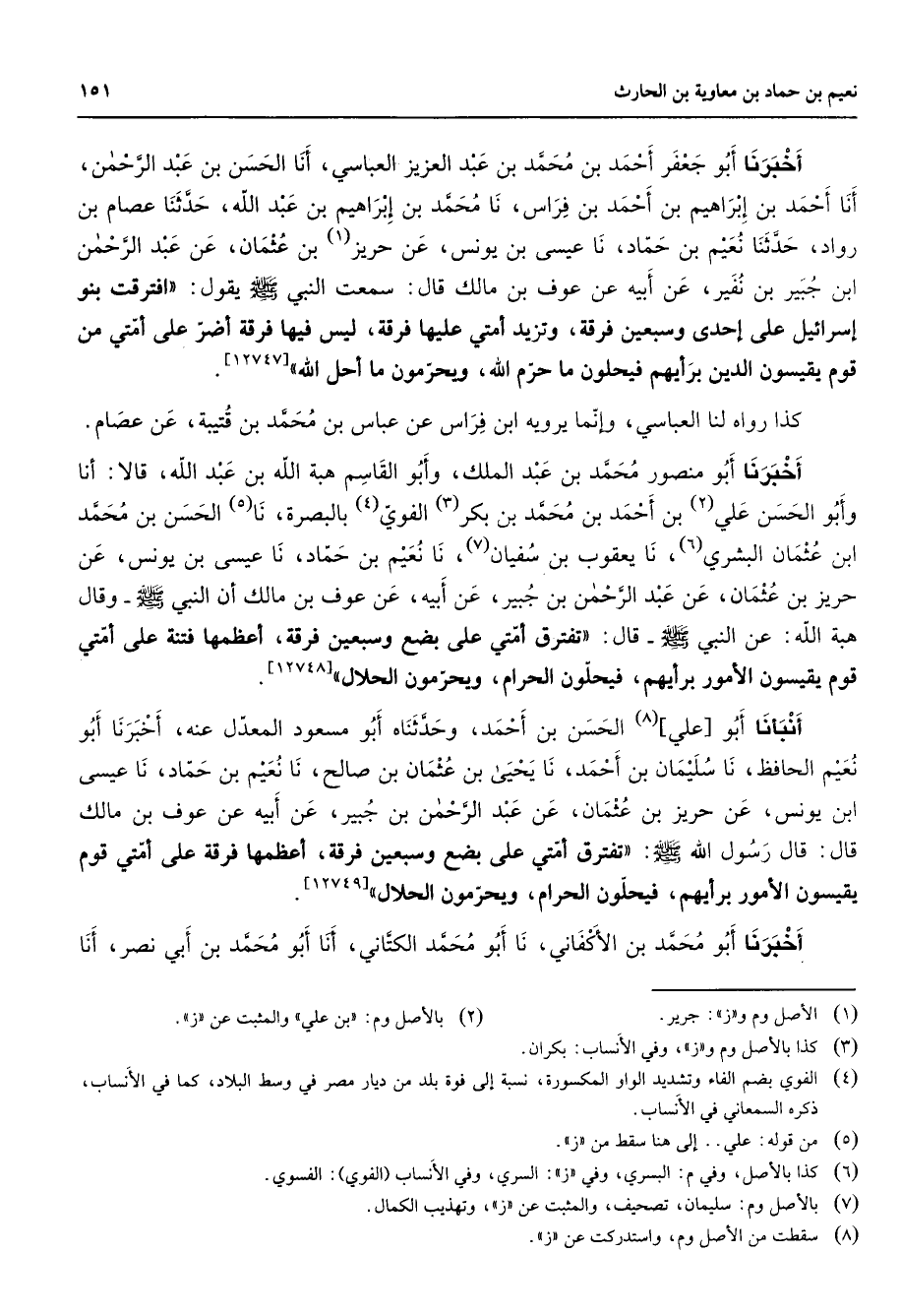 أخبرنا أبو جعفر أحمد بن محمد بن عبد العزيز العباسي أنا الحسن بن عبد الرحمن أنا أحمد بن إبراهيم بن أحمد بن فراس نا محمد بن إبراهيم بن عبد الله حدثنا عصام بن رواد حدثنا نعيم بن حماد نا عيسى بن يونس عن حريز (1) بن عثمان عن عبد الرحمن ابن جبير بن نفير عن أبيه عن عوف بن مالك قال سمعت النبي (صلى الله عليه وسلم) يقول افترقت بنو إسرائيل على إحدى وسبعين فرقة وتزيد أمتي عليها فرقة ليس فيها فرقة أضر على أمتي من قوم يقيسون الدين برأيهم فيحلون ما حرم الله ويحرمون ما أحل الله كذا رواه لنا العباسي وإنما يرويه ابن فراس عن عباس بن محمد بن قتيبة عن عصام أخبرنا أبو منصور محمد بن عبد الملك وأبو القاسم هبة الله بن عبد الله قالا أنا وأبو الحسن علي (2) بن أحمد بن محمد بن بكر (3) الفوي (4) بالبصرة نا (5) الحسن بن محمد ابن عثمان البشري (6) نا يعقوب بن سفيان (7) نا نعيم بن حماد نا عيسى بن يونس عن حريز بن عثمان عن عبد الرحمن بن جبير عن أبيه عن عوف بن مالك أن النبي (صلى الله عليه وسلم) وقال هبة الله عن النبي (صلى الله عليه وسلم) قال تفترق أمتي على بضع وسبعين فرقة أعظمها فتنة على أمتي قوم يقيسون الأمور برأيهم فيحلون الحرام ويحرمون الحلال أنبأنا أبو علي (8) الحسن بن أحمد وحدثناه أبو مسعود المعدل عنه أخبرنا أبو نعيم الحافظ نا سليمان بن أحمد نا يحيى بن عثمان بن صالح نا نعيم بن حماد نا عيسى ابن يونس عن حريز بن عثمان عن عبد الرحمن بن جبير عن أبيه عن عوف بن مالك قال قال رسول الله (صلى الله عليه وسلم) تفترق أمتي على بضع وسبعين فرقة أعظمها فرقة على أمتي قوم يقيسون الأمور برأيهم فيحلون الحرام ويحرمون الحلال أخبرنا أبو محمد بن الأكفاني نا أبو محمد الكتاني أنا أبو محمد بن ابي نصر أنا