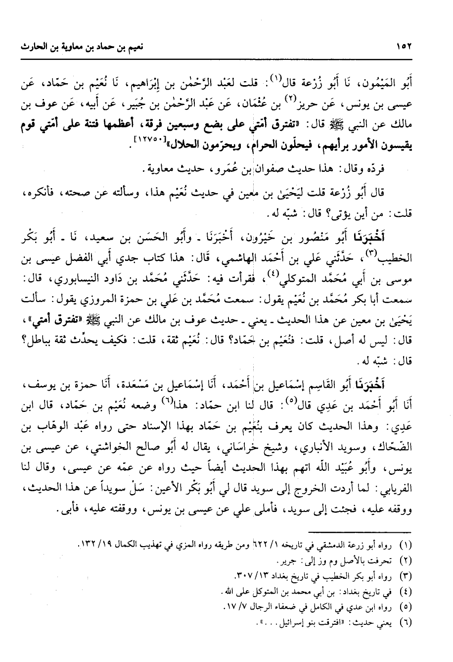 أبو الميمون نا أبو زرعة قال (1) قلت لعبد الرحمن بن إبراهيم نا نعيم بن حماد عن عيسى بن يونس عن حريز (2) بن عثمان عن عبد الرحمن بن جبير عن أبيه عن عوف بن مالك عن النبي (صلى الله عليه وسلم) قال تفترق أمتي على بضع وسبعين فرقة أعظمها فتنة على أمتي قوم يقيسون الأمور برأيهم فيحلون الحرام ويحرمون الحلال فرده وقال هذا حديث صفوان بن عمرو حديث معاوية قال أبو زرعة قلت ليحيى بن معين في حديث نعيم هذا وسألته عن صحته فأنكره قلت من أين يؤتى قال شبه له أخبرنا أبو منصور بن خيرون أخبرنا وأبو الحسن بن سعيد نا أبو بكر الخطيب (3) حدثني علي بن أحمد الهاشمي قال هذا كتاب جدي أبي الفضل عيسى بن موسى بن أبي محمد المتوكلي (4) فقرأت فيه حدثني محمد بن داود النيسابوري قال سمعت أبا بكر محمد بن نعيم يقول سمعت محمد بن علي بن حمزة المروزي يقول سألت يحيى بن معين عن هذا الحديث يعني حديث عوف بن مالك عن النبي (صلى الله عليه وسلم) تفترق أمتي قال ليس له أصل قلت فنعيم بن حماد قال نعيم ثقة قلت فكيف يحدث ثقة بباطل قال شبه له أخبرنا أبو القاسم إسماعيل بن أحمد أنا إسماعيل بن مسعدة أنا حمزة بن يوسف أنا أبو أحمد بن عدي قال (5) قال لنا ابن حماد هذا (6) وضعه نعيم بن حماد قال ابن عدي وهذا الحديث كان يعرف بنعيم بن حماد بهذا الإسناد حتى رواه عبد الوهاب بن الضحاك وسويد الأنباري وشيخ خراساني يقال له أبو صالح الخواشتي عن عيسى بن يونس وأبو عبيد الله اتهم بهذا الحديث أيضا حيث رواه عن عمه عن عيسى وقال لنا الفريابي لما أردت الخروج إلى سويد قال لي أبو بكر الأعين سل سويدا عن هذا الحديث ووقفه عليه فجئت إلى سويد فأملى علي عن عيسى بن يونس ووقفته عليه فأبى
