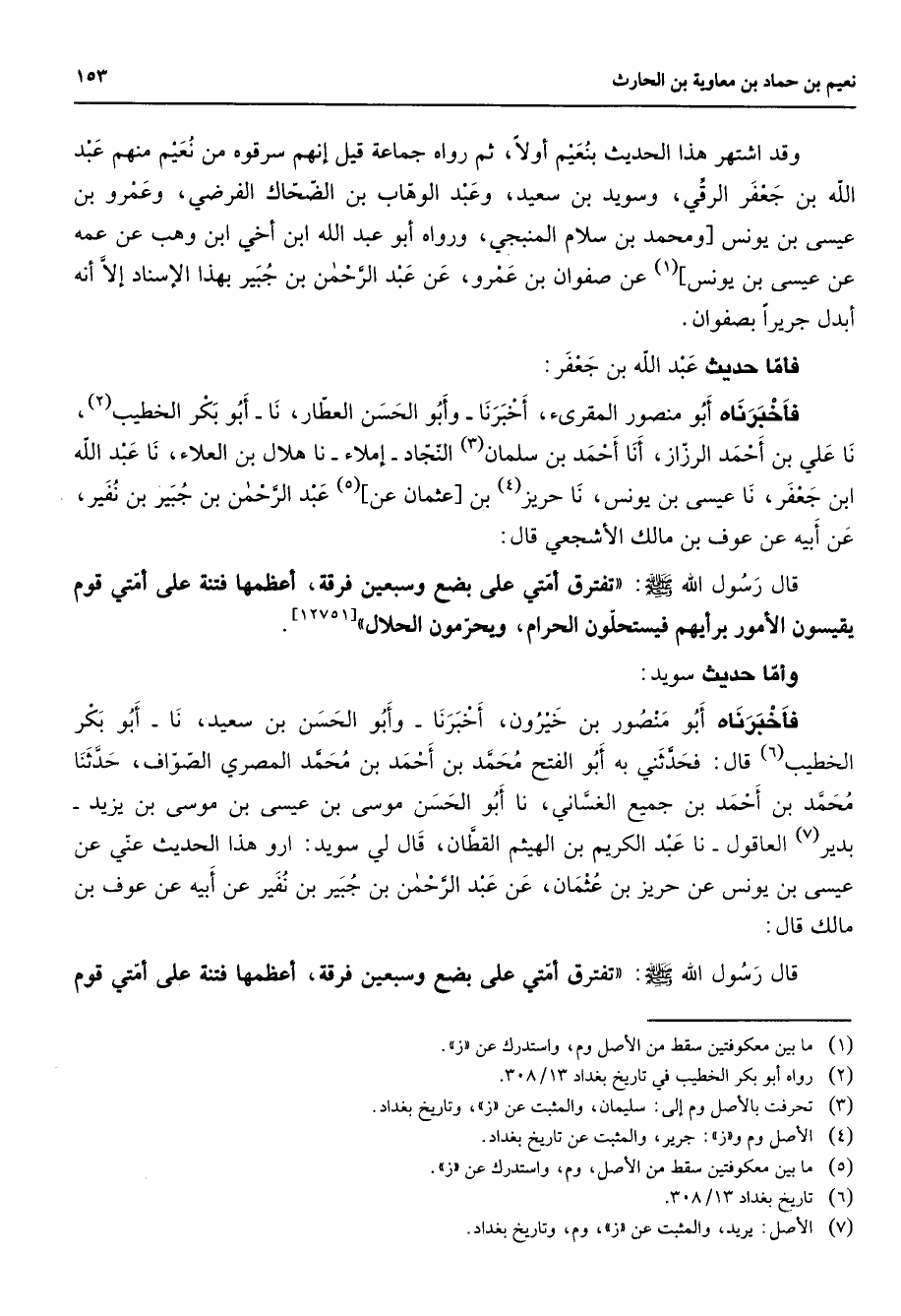 وقد اشتهر هذا الحديث بنعيم أولا ثم رواه جماعة قيل إنهم سرقوه من نعيم منهم عبد الله بن جعفر الرقي وسويد بن سعيد وعبد الوهاب بن الضحاك الفرضي وعمرو بن عيسى بن يونس ومحمد بن سلام المنبجي ورواه أبو عبد الله ابن أخي ابن وهب عن عمه عن عيسى بن يونس (1) عن صفوان بن عمرو عن عبد الرحمن بن جبير بهذا الإسناد إلا أنه أبدل جريرا بصفوان فأما حديث عبد الله بن جعفر فأخبرناه أبو منصور المقرئ أخبرنا وأبو الحسن العطار نا أبو بكر الخطيب (2) نا علي بن أحمد الرزاز أنا أحمد بن سلمان (3) النجاد إملاء نا هلال بن العلاء نا عبد الله ابن جعفرنا عيسى بن يونس نا حريز (4) بن عثمان عن (5) عبد الرحمن بن جبير بن نفير عن أبيه عن عوف بن مالك الأشجعي قال قال رسول الله (صلى الله عليه وسلم) تفترق أمتي على بضع وسبعين فرقة أعظمها فتنة على أمتي قوم يقيسون الأمور برأيهم فيستحلون الحرام ويحرمون الحلال وأما حديث سويد فأخبرناه أبو منصور بن خيرون أخبرنا وأبو الحسن بن سعيد نا أبو بكر الخطيب (6) قال فحدثني به أبو الفتح محمد بن أحمد بن محمد المصري الصواف حدثنا محمد بن أحمد بن جميع الغساني نا أبو الحسن موسى بن عيسى بن موسى بن يزيد بدير (7) العاقول نا عبد الكريم بن الهيثم القطان قال لي سويد ارو هذا الحديث عني عن عيسى بن يونس عن حريز بن عثمان عن عبد الرحمن بن جبير بن نفير عن أبيه عن عوف بن مالك قال قال رسول الله (صلى الله عليه وسلم) تفترق أمتي على بضع وسبعين فرقة أعظمها فتنة على أمتي قوم
