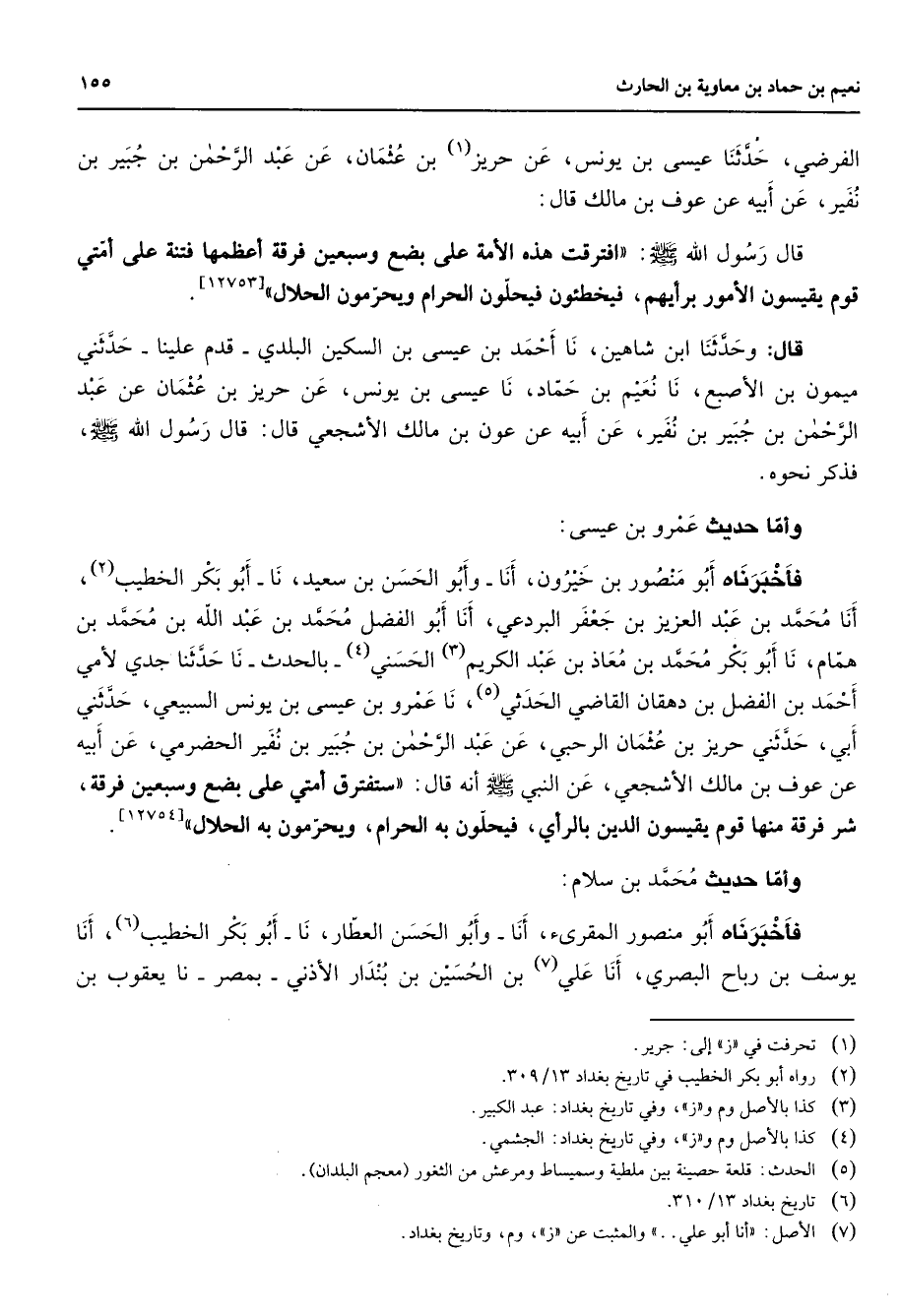 الفرضي حدثنا عيسى بن يونس عن حريز (1) بن عثمان عن عبد الرحمن بن جبير بن نفير عن أبيه عن عوف بن مالك قال قال رسول الله (صلى الله عليه وسلم) افترقت هذه الأمة على بضع وسبعين فرقة أعظمها فتنة على أمتي قوم يقيسون الأمور برأيهم فيخطئون فيحلون الحرام ويحرمون الحلال قال وحدثنا ابن شاهين نا أحمد بن عيسى بن السكين البلدي قدم علينا حدثني ميمون بن الأصبع نا نعيم بن حماد نا عيسى بن يونس عن حريز بن عثمان عن عبد الرحمن بن جبير بن نفير عن أبيه عن عون بن مالك الأشجعي قال قال رسول الله (صلى الله عليه وسلم) فذكر نحوه وأما حديث عمرو بن عيسى فأخبرناه أبو منصور بن خيرون أنا وأبو الحسن بن سعيد نا أبو بكر الخطيب (2) أنا محمد بن عبد العزيز بن جعفر البردعي أنا أبو الفضل محمد بن عبد الله بن محمد بن همام نا أبو بكر محمد بن معاذ بن عبد الكريم (3) الحسني (4) بالحدث نا حدثنا جدي لأمي أحمد بن الفضل بن دهقان القاضي الحدثي (5) نا عمرو بن عيسى بن يونس السبيعي حدثني أبي حدثني حريز بن عثمان الرحبي عن عبد الرحمن بن جبير بن نفير الحضرمي عن أبيه عن عوف بن مالك الأشجعي عن النبي (صلى الله عليه وسلم) أنه قال ستفترق أمتي على بضع وسبعين فرقة شر فرقة منها قوم يقيسون الدين بالرأي فيحلون به الحرام ويحرمون به الحلال وأما حديث محمد بن سلام فأخبرناه أبو منصور المقرئ أنا وأبو الحسن العطار نا أبو بكر الخطيب (6) أنا يوسف بن رباح البصري أنا علي بن الحسين بن بندار الأذني بمصر نا يعقوب بن