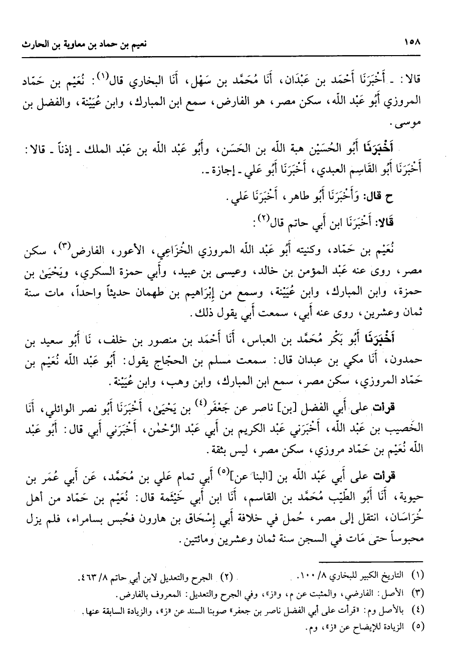 قالا أخبرنا أحمد بن عبدان أنا محمد بن سهل أنا البخاري (1) قال نعيم بن حماد المروزي أبو عبد الله سكن مصر هو الفارض سمع ابن المبارك وابن عيينة والفضل بن موسى أخبرنا أبو الحسين هبة الله بن الحسن وأبو عبد الله بن عبد الملك إذنا قالا أخبرنا أبو القاسم العبدي أخبرنا أبو علي إجازة ح قال وأخبرنا أبو طاهر أخبرنا علي قالا أخبرنا ابن أبي حاتم قال (2) نعيم بن حماد وكنيته أبو عبد الله المروزي الخزاعي الأعور الفارض (3) سكن مصر روى عنه عبد المؤمن بن خالد وعيسى بن عبيد وابي حمزة السكري ويحيى بن حمزة وابن المبارك وابن عيينة وسمع من إبراهيم بن طهمان حديثا واحدا مات سنة ثمان وعشرين روى عنه أبي سمعت أبي يقول ذلك أخبرنا أبو بكر محمد بن العباس أنا أحمد بن منصور بن خلف نا أبو سعيد بن حمدون أنا مكي بن عبدان قال سمعت مسلم بن الحجاج يقول أبو عبد الله نعيم بن حماد المروزي سكن مصر سمع ابن المبارك وابن وهب وابن عيينة قرأت على أبي الفضل بن ناصر عن جعفر (4) بن يحيى أخبرنا أبو نصر الوائلي أنا الخصيب بن عبد الله أخبرني عبد الكريم بن أبي عبد الرحمن اخبرني ابي قال أبو عبد الله نعيم بن حماد مروزي سكن مصر ليس بثقة قرأت على أبي عبد الله بن البنا عن (5) أبي تمام علي بن محمد عن أبي عمر بن حيوية أنا أبو الطيب محمد بن القاسم أنا ابن أبي خيثمة قال نعيم بن حماد من اهل خراسان انتقل إلى مصر حمل في خلافة أبي إسحاق بن هارون فحبس بسامراء فلم يزل محبوسا حتى مات في السجن سنة ثمان وعشرين ومائتين