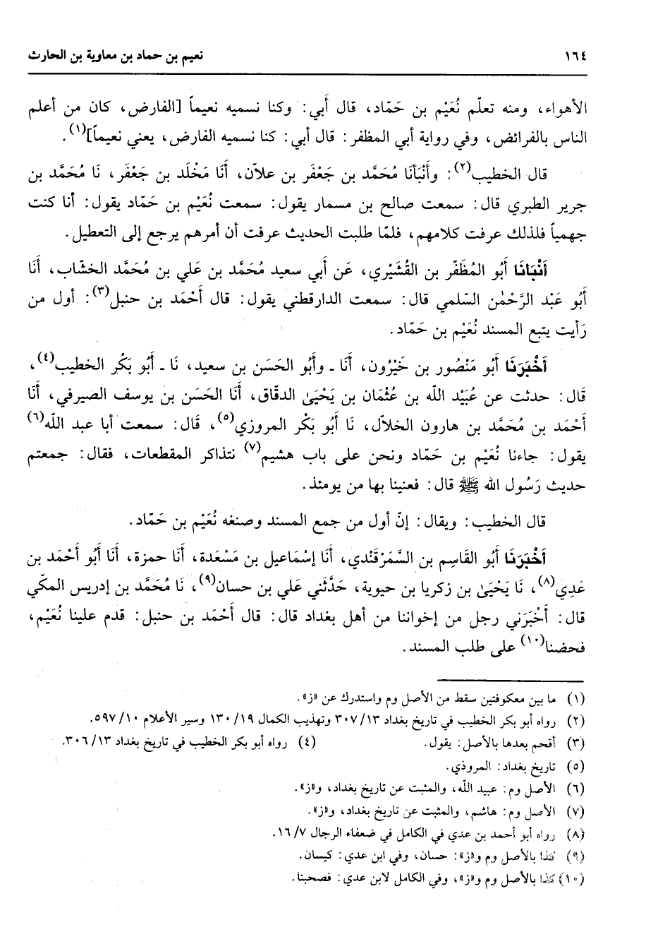 الأهواء ومنه تعلم نعيم بن حماد قال أبي وكنا نسميه نعيما الفارض كان من أعلم الناس بالفرائض وفي رواية أبي المظفر قال أبي نسميه الفارض يعني نعيما (1) قال الخطيب (2) وأنبأنا محمد بن جعفر بن علان أنا مخلد بن جعفر نا محمد بن جرير الطبري قال سمعت صالح بن مسمار يقول سمعت نعيم بن حماد يقول أنا كنت جهميا فلذلك عرفت كلامهم فلما طلبت الحديث عرفت أن أمرهم يرجع إلى التعطيل أنبأنا أبو المظفر بن القشيري عن أبي سعيد محمد بن علي بن محمد الخشاب أنا أبو عبد الرحمن السلمي قال سمعت الدارقطني يقول قال أحمد بن حنبل (3) أول من رأيت يتبع المسند نعيم بن حماد أخبرنا أبو منصور بن خيرون أنا وابو الحسن بن سعيد نا أبو بكر الخطيب (4) قال حدثت عن عبيد الله بن عثمان بن يحيى الدقاق أنا الحسن بن يوسف الصيرفي أنا أحمد بن محمد بن هارون الخلال نا أبو بكر المروزي (5) قال سمعت أبا عبد الله (6) يقول جاءنا نعيم بن حماد ونحن على باب هشيم (7) نتذاكر المقطعات فقال جمعتم حديث رسول الله (صلى الله عليه وسلم) قال فعنينا بها من يومئذ قال الخطيب ويقال إن أول من جمع المسند وصنغه نعيم بن حماد أخبرنا أبو القاسم بن السمرقندي أنا إسماعيل بن مسعدة أنا حمزة أنا أبو أحمد بن عدي (8) نا يحيى بن زكريا بن حيوية حدثني علي بن حسان (9) نا محمد بن إدريس المكي قال أخبرني رجل من إخواننا من أهل بغداد قال قال أحمد بن حنبل قدم علينا نعيم فحضنا على طلب المسند