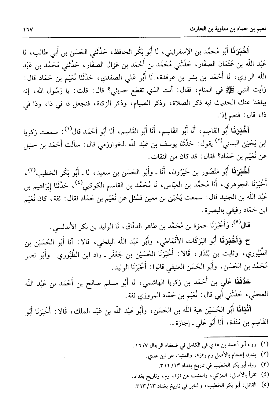 أخبرنا أبو محمد بن الإسفرايني نا أبو بكر الحافظ حدثني الحسن بن أبي طالب نا عبد الله بن عثمان الصفار حدثني محمد بن أحمد بن غزال الصفار حدثني محمد بن عبد الله الرازي نا أحمد بن بشر بن عرقدة نا أبو علي الصفدي حدثنا نعيم بن حماد قال رأيت النبي (صلى الله عليه وسلم) في المنام فقال أنت الذي تقطع حديثي قال قلت يا رسول الله إنه يبلغنا عنك الحديث فيه ذكر الصلاة وذكر الصيام وذكر الزكاة فنجعل ذا في ذا وذا في ذا قال فنعم إذا أخبرنا أبو القاسم أنا أبو القاسم أنا أبو القاسم أنا أبو أحمد (1) قال سمعت زكريا ابن يحيى البستي (2) يقول حدثنا يوسف بن عبد الله الخوارزمي قال سألت أحمد بن حنبل عن نعيم بن حماد فقال قد كان من الثقات أخبرنا أبو منصور بن خيرون أنا وأبو الحسن بن سعيد نا أبو بكر الخطيب (3) أخبرنا الجوهري أنا محمد بن العباس نا محمد بن القاسم الكوكبي (4) حدثنا إبراهيم بن عبد الله بن الجنيد قال سمعت يحيى بن معين فسئل عن نعيم بن حماد فقال ثقة كان نعيم ابن حماد رفيقي بالبصرة قال (5) وأخبرنا حمزة بن محمد بن طاهر الدقاق نا الوليد بن بكر الأندلسي ح أخبرنا أبو البركات الأنماطي وأبو عبد الله البلخي قالا أنا أبو الحسين بن الطيوري وثابت بن بندار قالا أخبرنا الحسين بن جعفر زاد ابن الطيوري وأبو نصر محمد بن الحسن وأبو الحسن العتيقي قالوا أخبرنا الوليد حدثنا علي بن أحمد بن زكريا الهاشمي نا أبو مسلم صالح بن احمد بن عبد الله العجلي حدثني أبي قال نعيم بن حماد المروزي ثقة انبأنا أبو الحسين هبة الله بن الحسن وأبو عبد الله بن عبد الملك قالا أخبرنا أبو القاسم بن مندة أنا أبو علي إجازة