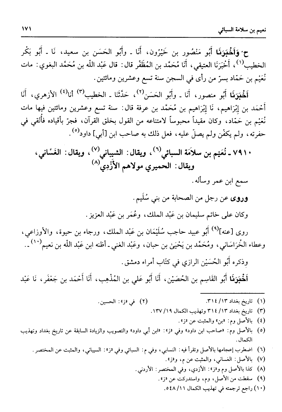 7910 - نعيم بن سلامة السبائي (6) ويقال الشيباني (7) ويقال الغساني ويقال الحميري مولاهم الأزدي (8) سمع ابن عمر وسأله وروى عن رجل من الصحابة من بني سليم وكان على خاتم سليمان بن عبد الملك وعمر بن عبد العزيز روى عنه (9) أبو عبيد حاجب سليمان بن عبد الملك ورجاء بن حيوة والأوزاعي وعطاء الخراساني ومحمد بن يحيى بن حبان وعبد الغني أظنه ابن عبد الله بن نعيم (10) وذكره أبو الحسين الرازي في كتاب أمراء دمشق أخبرنا أبو القاسم بن الحصين أنا أبو علي بن المذهب أنا أحمد بن جعفر نا عبد