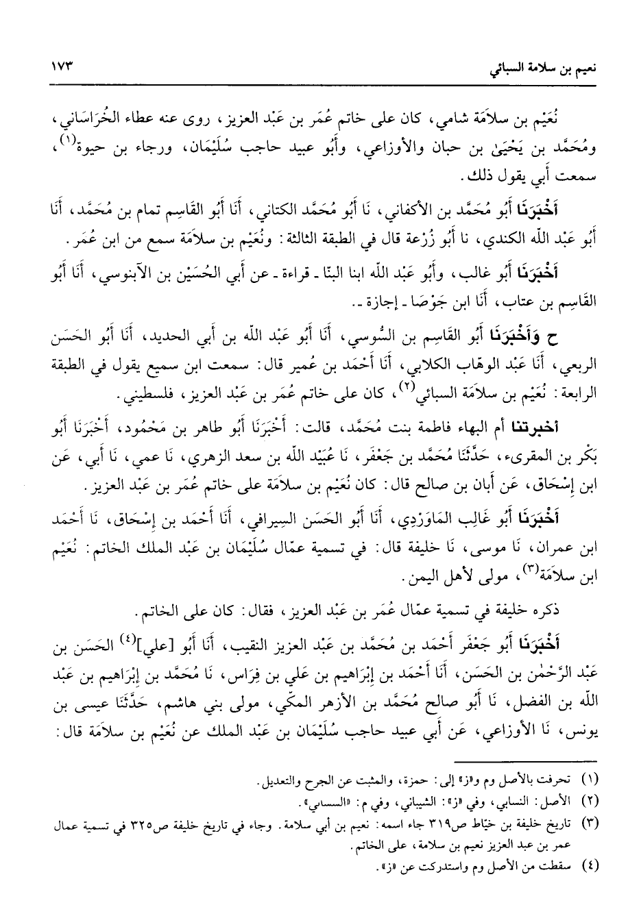 نعيم بن سلامة شامي كان على خاتم عمر بن عبد العزيز روى عنه عطاء الخراساني ومحمد بن يحيى بن حبان والأوزاعي وأبو عبيد حاجب سليمان ورجاء بن حيوة (1) سمعت أبي يقول ذلك أخبرنا أبو محمد بن الأكفاني نا أبو محمد الكتاني أنا أبو القاسم تمام بن محمد أنا أبو عبد الله الكندي نا أبو زرعة قال في الطبقة الثالثة ونعيم بن سلامة سمع من ابن عمر أخبرنا أبو غالب وابو عبد الله ابنا البنا قراءة عن أبي الحسين بن الآبنوسي أنا أبو القاسم بن عتاب أنا ابن جوصا إجازة ح وأخبرنا أبو القاسم بن السوسي أنا أبو عبد الله بن أبي الحديد أنا أبو الحسن الربعي أنا عبد الوهاب الكلابي أنا أحمد بن عمير قال سمعت ابن سميع يقول في الطبقة الرابعة نعيم بن سلامة السبائي (2) كان على خاتم عمر بن عبد العزيز فلسطيني أخبرتنا أم البهاء فاطمة بنت محمد قالت أخبرنا أبو طاهر بن محمود أخبرنا أبو بكر بن المقرئ حدثنا محمد بن جعفر نا عبيد الله بن سعد الزهري نا عمي نا أبي عن ابن إسحاق عن أبان بن صالح قال كان نعيم بن سلامة على خاتم عمر بن عبد العزيز أخبرنا أبو غالب الماوردي أنا أبو الحسن السيرافي أنا أحمد بن إسحاق نا أحمد ابن عمران نا موسى نا خليفة قال في تسمية عمال سليمان بن عبد الملك الخاتم نعيم ابن سلامة (3) مولى لأهل اليمن ذكره خليفة في تسمية عمال عمر بن عبد العزيز فقال كان على الخاتم أخبرنا أبو جعفر أحمد بن محمد بن عبد العزيز النقيب أنا أبو علي (4) الحسن بن عبد الرحمن بن الحسن أنا أحمد بن إبراهيم بن علي بن فراس نا محمد بن إبراهيم بن عبد الله بن الفضل نا أبو صالح محمد بن الأزهر المكي مولى بني هاشم حدثنا عيسى بن يونس نا الأوزاعي عن أبي عبيد حاجب سليمان بن عبد الملك عن نعيم بن سلامة قال