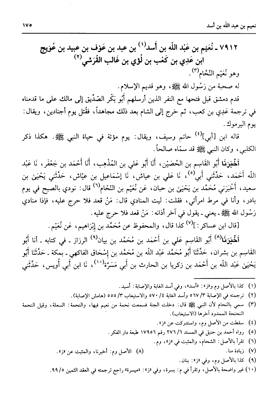 7912 - نعيم بن عبد الله بن أسد (1) بن عبد بن عوف بن عبيد بن عويج ابن عدي بن كعب بن لؤي بن غالب القرشي (2) وهو نعيم النحام (3) له صحبة من رسول الله (صلى الله عليه وسلم) وهو قديم الإسلام قدم دمشق قبل فتحها مع النفر الذين أرسلهم أبو بكر الصديق إلى مالك على ما قدمناه في ترجمة عدي بن كعب ثم خرج إلى الشام بعد ذلك مجاهدا فقتل يوم أجنادين ويقال يوم اليرموك قال ابن أبي (4) حاتم وسيف ويقال يوم مؤتة في حياة النبي (صلى الله عليه وسلم) هكذا ذكر الكلبي وكان النبي (صلى الله عليه وسلم) قد سماه صالحا أخبرنا أبو القاسم بن الحصين أنا أبو علي بن المذهب أنا أحمد بن جعفر نا عبد الله أحمد حدثني أبي (5) نا علي بن عياش نا إسماعيل بن عياش حدثني يحيى بن سعيد أخبرني محمد بن يحيى بن حبان عن نعيم بن النحام (6) قال نودي بالصبح في يوم بادر وأنا في مرط امرأتي فقلت ليت المنادي قال من قعد فلا حرج عليه فإذا منادي رسول الله (صلى الله عليه وسلم) يعني يقول في آخر أذانه من قعد فلا حرج عليه قال ابن عساكر (7) كذا قال والمحفوظ عن محمد بن إبراهيم عن نعيم أخبرنا (8) أبو القاسم علي بن أحمد بن محمد بن بيان (9) الرزاز في كتابه أنا أبو القاسم بن بشران حدثنا أبو محمد عبد الله بن محمد بن إسحاق الفاكهي بمكة حدثنا أبو يحيى عبد الله بن أحمد بن زكريا بن الحارث بن أبي (10) مسرة نا ابن ابي أويس حدثني