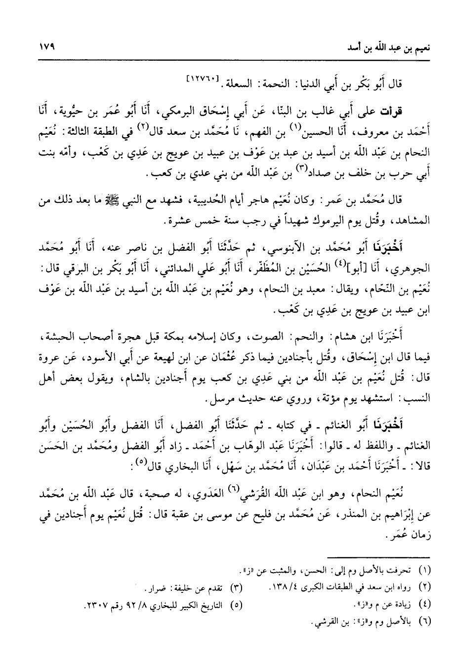 قال أبو بكر بن أبي الدنيا النحمة السعلة قرأت على أبي غالب بن البنا عن أبي إسحاق البرمكي أنا أبو عمر بن حيوية أنا احمد بن معروف أنا الحسين (1) بن الفهم نا محمد بن سعد قال (2) في الطبقة الثالثة نعيم النحام بن عبد الله بن أسيد بن عبد بن عوف بن عبيد عن عويج بن عدي بن كعب وأمه بنت أبي حرب بن خلف بن صداد (3) بن عبد الله من بني عدي بن كعب قال محمد بن عمر وكان نعيم هاجر أيام الحديبية فشهد مع النبي (صلى الله عليه وسلم) ما بعد ذلك من المشاهد وقتل يوم اليرموك شهيدا في رجب سنة خمس عشرة أخبرنا أبو محمد بن الآبنوسي ثم حدثنا أبو الفضل بن ناصر عنه أنا أبو محمد الجوهري أنا أبو (4) الحسين بن المظفر أنا أبو علي المدائني أنا أبو بكر بن البرقي قال نعيم بن النحام ويقال معبد بن النحام وهو نعيم بن عبد الله بن أسيد بن عبد الله بن عوف ابن عبيد بن عويج بن عدي بن كعب أخبرنا ابن هشام والنحم الصوت وكان إسلامه بمكة قبل هجرة أصحاب الحبشة فيما قال ابن إسحاق وقتل بأجنادين فيما ذكر عثمان عن ابن لهيعة عن أبي الأسود عن عروة قال قتل نعيم بن عبد الله من بني عدي بن كعب يوم أجنادين بالشام ويقول بعض أهل النسب استشهد يوم مؤتة وروي عنه حديث مرسل أخبرنا أبو الغنائم في كتابه ثم حدثنا أبو الفضل أنا الفضل وأبو الحسين وابو الغنائم واللفظ له قالوا أخبرنا عبد الوهاب بن أحمد زاد أبو الفضل ومحمد بن الحسن قالا أخبرنا احمد بن عبدان أنا محمد بن سهل أنا البخاري قال (5) نعيم النحام وهو ابن عبد الله القرشي (6) العدوي له صحبة قال عبد الله بن محمد عن إبراهيم بن المنذر عن محمد بن فليح عن موسى بن عقبة قال قتل نعيم يوم أجنادين في زمان عمر