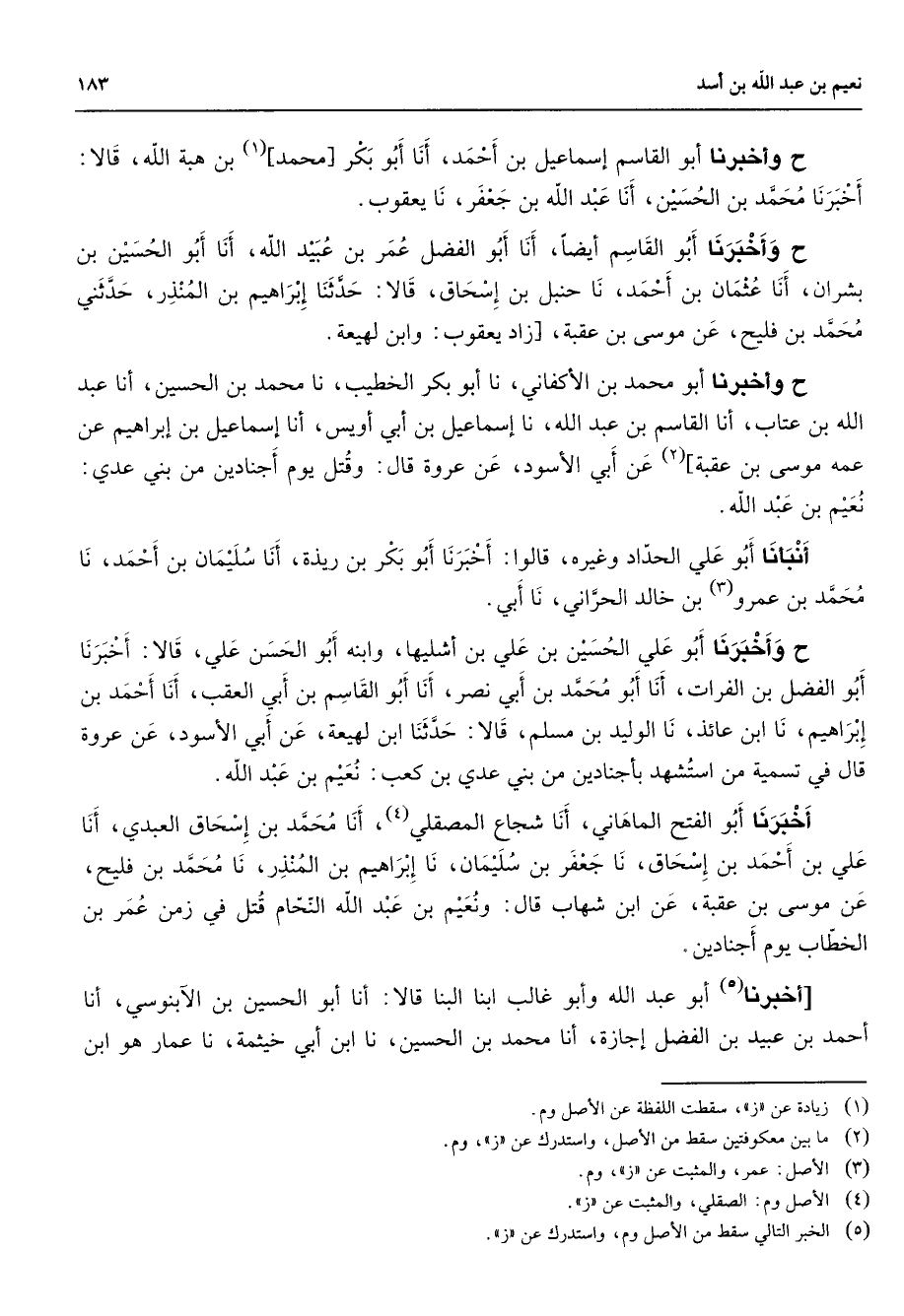 ح وأخبرنا أبو القاسم إسماعيل بن احمد أنا أبو بكر محمد (1) بن هبة الله قالا أخبرنا محمد بن الحسين أنا عبد الله بن جعفر نا يعقوب ح وأخبرنا أبو القاسم أيضا أنا أبو الفضل عمر بن عبيد الله أنا أبو الحسين بن بشران أنا عثمان بن أحمد نا حنبل بن إسحاق قالا حدثنا إبراهيم بن المنذر حدثني محمد بن فليح عن موسى بن عقبة زاد يعقوب وابن لهيعة ح وأخبرنا أبو محمد بن الأكفاني نا أبو بكر الخطيب نا محمد بن الحسين أنا عبد الله بن عتاب أنا القاسم بن عبد الله نا إسماعيل بن أبي أويس أنا إسماعيل بن إبراهيم عن عمه موسى بن عقبة (2) عن أبي الأسود عن عروة قال وقتل يوم أجنادين من بني عدي نعيم بن عبد الله أنبأنا أبو علي الحداد وغيره قالوا أخبرنا أبو بكر بن ريذة أنا سليمان بن أحمد نا محمد بن عمرو (3) بن خالد الحراني نا أبي ح أخبرنا أبو علي الحسين بن علي بن أشليها وابنه أبو الحسن علي قالا أخبرنا أبو الفضل بن الفرات أنا أبو محمد بن أبي نصر أنا أبو القاسم بن أبي العقب أنا أحمد بن إبراهيم نا ابن عائذ نا الوليد بن مسلم قالا حدثنا ابن لهيعة عن أبي الأسود عن عروة قال في تسمية من استشهد بأجنادين من بني عدي بن كعب نعيم بن عبد الله أخبرنا أبو الفتح الماهاني أنا شجاع المصقلي (4) أنا محمد بن إسحاق العبدي أنا علي بن أحمد بن إسحاق نا جعفر بن سليمان نا إبراهيم بن المنذر نا محمد بن فليح عن موسى بن عقبة عن ابن شهاب قال ونعيم بن عبد الله النحام قتل في زمن عمر بن الخطاب يوم أجنادين أخبرنا (5) أبو عبد الله وأبو غالب ابنا البنا قالا أنا أبو الحسين بن الآبنوسي أنا أحمد بن عبيد بن الفضل إجازة أنا محمد بن الحسين نا ابن أبي خيثمة نا عمار هو ابن