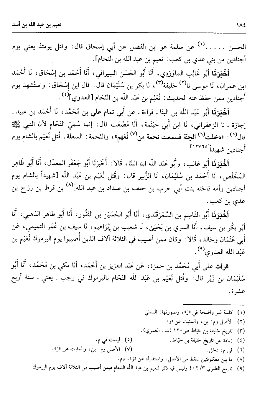 (9) تاريخ الطبري 3 / 402 وليس في ذكر لنعيم بن عبد الله النحام فيمن أصيب من الثلاثة الاف يوم اليرموك