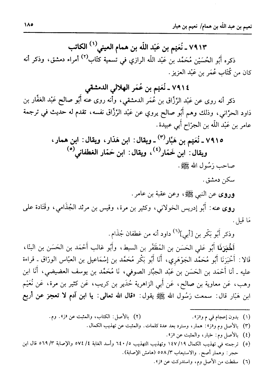 7913 - نعيم بن عبد الله بن همام العيني (1) الكاتب ذكره أبو الحسين محمد بن عبد الله الرازي في تسمية كتاب (2) أمراء دمشق وذكر أنه كان من كتاب عمر بن عبد العزيز