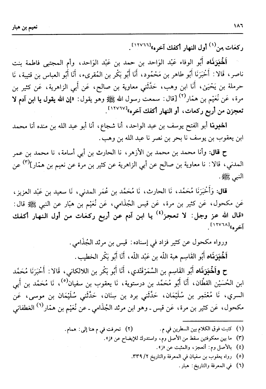 ركعات (1) من أول النهار أكفك آخره أخبرناه أبو الوفاء عبد الواحد بن حمد بن عبد الواحد وأم المجتبى فاطمة بنت ناصر قالا أخبرنا أبو طاهر بن محمود أنا أبو بكر بن المقرئ أنا أبو العباس بن قتيبة نا حرملة بن يحيى أنا ابن وهب حدثني معاوية بن صالح عن أبي الزاهرية عن كثير بن مرة عن نعيم بن همار (2) قال سمعت رسول الله (صلى الله عليه وسلم) وهو يقول إن الله يقول يا ابن آدم لا تعجزن من أربع ركعات أو النهار أكفك آخره أخبرنا أبو الفتح يوسف بن عبد الواحد أنا شجاع أنا أبو عبد الله بن منده أنا محمد ابن يعقوب بن يوسف نا بحر بن نصر نا عبد الله بن وهب ح قال وأنا محمد بن محمد بن الأزهر نا الحارث بن أبي أسامة نا محمد بن عمر المدني قالا نا معاوية بن صالح عن أبي الزاهرية عن كثير بن مرة عن نعيم بن همار (3) عن النبي (صلى الله عليه وسلم) قال وأخبرنا محمد نا الحارث نا محمد بن عمر المدني نا سعيد بن عبد العزيز عن مكحول عن كثير بن مرة عن قيس الجذامي عن نعيم بن هبار عن النبي (صلى الله عليه وسلم) قال قال الله عز وجل لا تعجز (4) يا ابن آدم عن أربع ركعات من أول النهار أكفك آخره ورواه مكحول عن كثير فزاد في إسناده قيس بن مرثد الجذامي أخبرناه أبو القاسم هبة الله بن عبد الله أنا أبو بكر الخطيب ح وأخبرناه أبو القاسم بن السمرقندي أنا أبو بكر بن اللالكاني قالا أخبرنا محمد ابن الحسين القطان أنا أبو محمد بن درستوية نا يعقوب بن سفيان (5) نا محمد بن أبي السري نا معتمر بن سليمان حدثني برد بن سنان حدثني سليمان بن موسى عن مكحول عن كثير بن مرة عن قيس وهو ابن مرثد الجذامي عن نعيم بن همار (6) الغطفاني