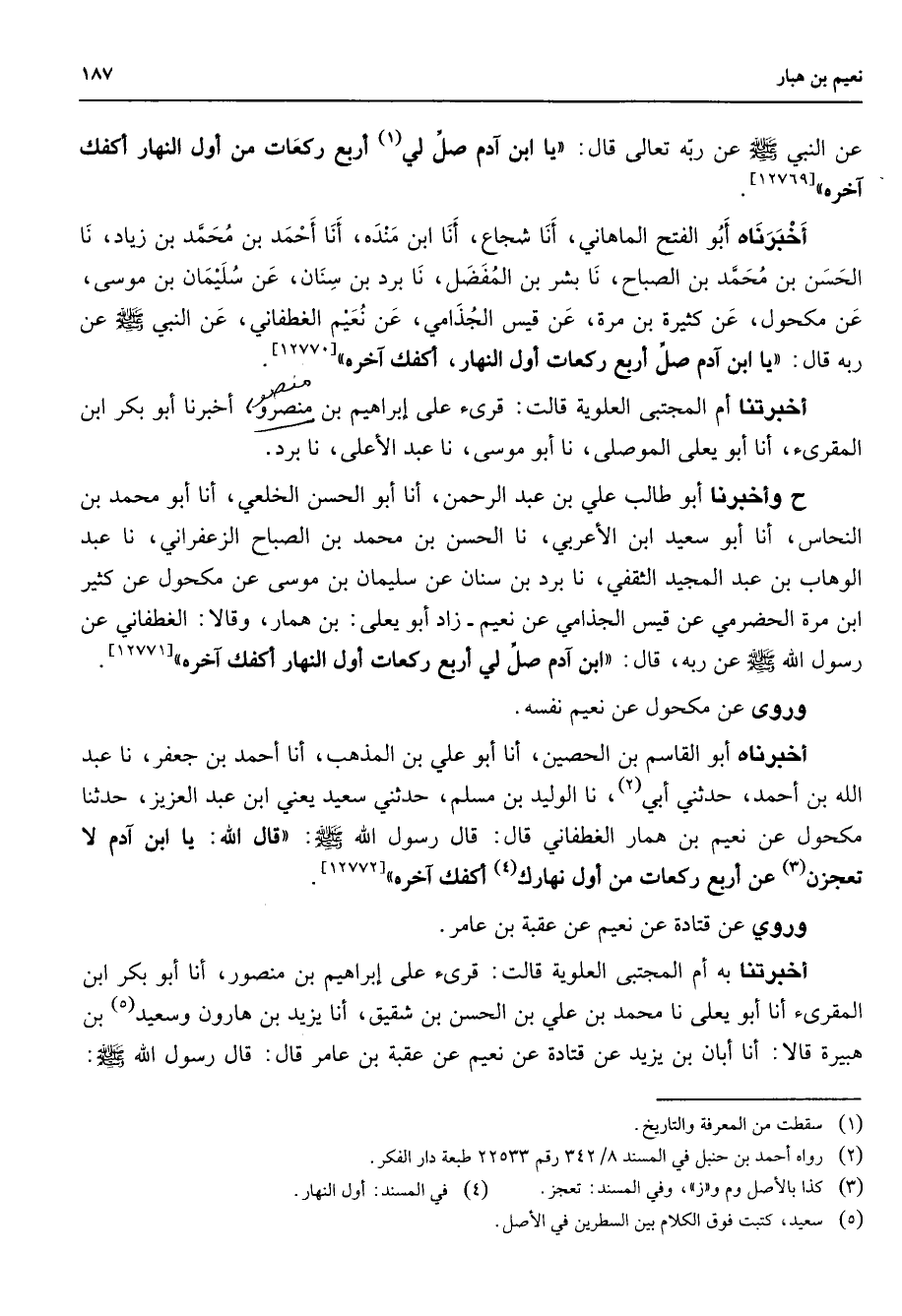 عن النبي (صلى الله عليه وسلم) عن ربه تعالى قال يا ابن آدم صل لي (1) أربع ركعات من أول النهار أكفك آخره أخبرناه أبو الفتح الماهاني أنا شجاع أنا ابن منده أنا أحمد بن محمد بن زياد نا الحسن بن محمد بن الصباح نا بشر بن المفضل نا برد بن سنان عن سليمان بن موسى عن مكحول عن كثيرة بن مرة عن قيس الجذامي عن نعيم الغطفاني عن النبي (صلى الله عليه وسلم) عن ربه قال يا ابن آدم صل أربع ركعات أول النهار أكفك آخره أخبرتنا أم المجتبى العلوية قالت قرئ على إبراهيم بن منصرو أخبرنا أبو بكر ابن المقرئ أنا أبو يعلى الموصلي نا أبو موسى نا عبد الأعلى نا برد ح اخبرنا أبو طالب علي بن عبد الرحمن أنا أبو الحسن الخلعي أنا أبو محمد بن النحاس أنا أبو سعيد ابن الأعرابي نا الحسن بن محمد بن الصباح الزعفراني نا عبد الوهاب بن عبد المجيد الثقفي نا برد بن سنان عن سليمان بن موسى عن مكحول عن كثير ابن مرة الحضرمي عن قيس الجذامي عن نعيم زاد أبو يعلى بن همار وقالا الغطفاني عن رسول الله (صلى الله عليه وسلم) عن ربه قال ابن آدم صل لي أربع ركعات أول النهار أكفك آخرهح وروى عن مكحول عن نعيم نفسه اخبرناه أبو القاسم بن الحصين أنا أبو علي بن المذهب أنا أحمد بن جعفر نا عبد الله بن أحمد حدثني أبي (2) نا الوليد بن مسلم حدثني سعيد يعني ابن عبد العزيز حدثنا مكحول عن نعيم بن همار الغطفاني قال قال رسول الله (صلى الله عليه وسلم) قال الله يا ابن آدم لا تعجزن (3) عن أربع ركعات من أول نهارك (4) أكفك آخره وروى عن قتادة عن نعيم عن عقبة بن عامر أخبرتنا به أم المجتبى العلوية قالت قرئ على إبراهيم بن منصور أنا أبو بكر ابن المقرئ أنا أبو يعلى نا محمد بن علي بن الحسن بن شقيق أنا يزيد بن هارون وسعيد (5) بن هبيرة قالا أناابان بن يزيد عن قتادة عن نعيم عن عقبة بن عامر قال قال رسول الله (صلى الله عليه وسلم)