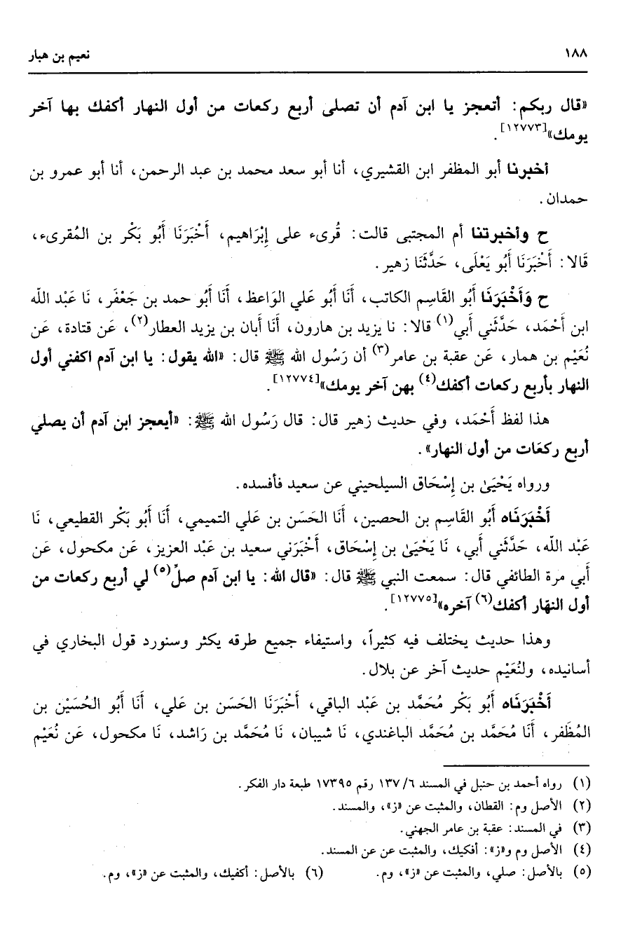 قال ربكم أتعجز يا ابن آدم أن تصلى أربع ركعات من اول النهار أكفك بها أخر يومك أخبرنا أبو المظفر ابن القشيري أنا أبو سعد محمد بن عبد الرحمن أنا أبو عمرو بن حمدان ح وأخبرتنا أم المجتبى قالت قرئ على إبراهيم أخبرنا أبو بكر بن المقرئ قالا أخبرنا أبو يعلى حدثنا زهير ح وأخبرنا أبو القاسم الكاتب أنا أبو علي الواعظ أنا أبو حمد بن جعفر نا عبد الله ابن احمد حدثني أبي (1) قالا نا يزيد بن هارون أنا ابان بن يزيد العطار (2) عن قتادة عن نعيم بن همار عن عقبة بن عامر (3) أن رسول الله (صلى الله عليه وسلم) قال الله يقول يا ابن آدم اكفني أول النهار باربع ركعات أكفك (4) بهن آخر يومك هذا لفظ أحمد وفي حديث زهير قال قال رسول الله (صلى الله عليه وسلم) أيعجز ابن آدم أن يصلي أربع ركعات من أول النهار ورواه يحيى بن إسحاق السيلحيني عن سعيد فأفسده أخبرناه أبو القاسم بن الحصين أنا الحسن بن علي التميمي أنا أبو بكر القطيعي نا عبد الله حدثني أبي نا يحيى بن إسحاق أخبرني سعيد بن عبد العزيز عن مكحول عن أبي مرة الطائفي قال سمعت النبي (صلى الله عليه وسلم) قال قال الله يا ابن آدم صل (5) لي أربع ركعات من أول النهار أكفك (6) آخره وهذا حديث يختلف فيه كثيرا واستيفاء جميع طرقه يكثر وسنورد قول البخاري في أسانيده ولنعيم حديث آخر عن بلال أخبرناه أبو بكر محمد بن عبد الباقي أخبرنا الحسن بن علي أنا أبو الحسين بن المظفر أنا محمد بن محمد الباغندي نا شيبان نا محمد بن راشد نا مكحول عن نعيم