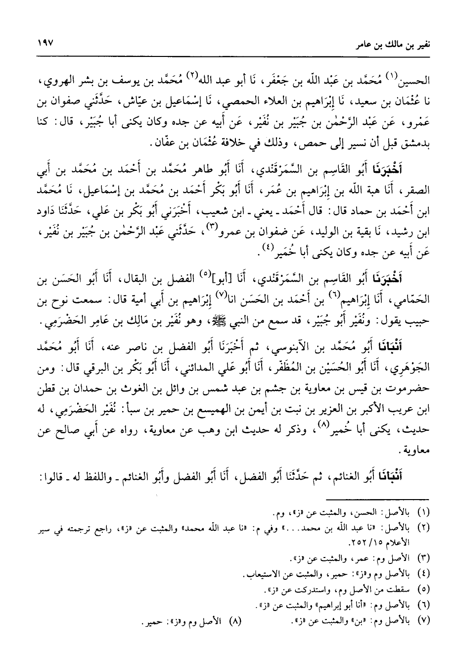 الحسين (1) محمد بن عبد الله بن جعفر نا أبو عبد الله (2) محمد بن يوسف بن بشر الهروي نا عثمان بن سعيد نا إبراهيم بن العلاء الحمصي نا إسماعيل بن عياش حدثني صفوان بن عمرو عن عبد الرحمن بن جبير بن نفير عن ابيه عن جده وكان يكنى ابا جبير قال كنا بدمشق قبل أن نسير إلى حمص وذلك في خلافة عثمان بن عفان اخبرنا أبو القاسم بن السمرقندي أنا أبو طاهر محمد بن احمد بن محمد بن أبي الصقر أنا هبة الله بن إبراهيم بن عمر أنا أبو بكر أحمد بن محمد بن إسماعيل نا محمد ابن أحمد بن حماد قال قال أحمد يعني ابن شعيب أخبرني أبو بكر بن علي حدثنا داود ابن رشيد نا بقية بن الوليد عن صفوان بن عمرو (3) حدثني عبد الرحمن بن جبير بن نفير عن أبيه عن جده وكان يكنى ابا خمير (4) اخبرنا أبو القاسم بن السمرقندي أنا أبو (5) الفضل بن البقال أنا أبو الحسن بن الحمامي أنا إبراهيم (6) بن أحمد بن الحسن أنا (7) إبراهيم بن أبي أمية قال سمعت نوح بن حبيب يقول ونفير أبو جبير قد سمع من النبي (صلى الله عليه وسلم) وهو نفير بن مالك بن عامر الحضرمي أنبأنا أبو محمد بن الآبنوسي ثم أخبرنا أبو الفضل بن ناصر عنه أنا أبو محمد الجوهري أنا أبو الحسين بن المظفر أنا أبو علي المدائني أنا أبو بكر بن البرقي قال ومن حضرموت بن قيس بن معاوية بن جشم بن عبد شمس بن وائل بن الغوث بن حمدان بن قطن ابن عريب الأكبر بن العزيز بن نبت بن أيمن بن الهميسع بن حمير بن سبأ نفير الحضرمي له حديث يكنى أبا خمير (8) وذكر له حديث ابن وهب عن معاوية رواه عن ابي صالح عن معاوية انبأنا أبو الغنائم ثم حدثنا أبو الفضل أنا أبو الفضل وأبو الغنائم واللفظ له قالوا