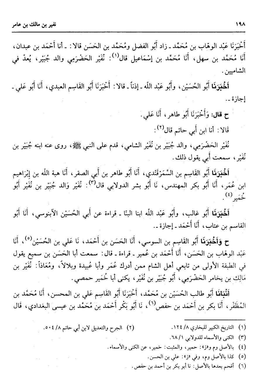 أخبرنا عبد الوهاب بن محمد زاد أبو الفضل ومحمد بن الحسن قالا أنااحمد بن عبدان أنا محمد بن سهل أنا محمد بن إسماعيل قال (1) نفير الحضرمي والد جبير يعد في الشاميين أخبرنا أبو الحسين وأبو عبد الله إذنا قالا أخبرنا أبو القاسم العبدي أنا أبو علي إجازة ح قال وأخبرنا أبو طاهر أنا علي قالا أنا ابن أبي حاتم قال (2) نفير الحضرمي والد جبير بن نفير الشامي قدم على النبي (صلى الله عليه وسلم) روى عنه ابنه جبير بن نفير سمعت أبي يقول ذلك أخبرنا أبو القاسم بن السمرقندي أنا أبو طاهر بن أبي الصقر أنا هبة الله بن إبراهيم ابن عمر أنا أبو بكر المهندس نا أبو بشر الدولابي قال (3) نفير والد جبير بن نفير أبو خمير (4) أخبرنا أبو غالب وأبو عبد الله ابنا البنا قراءة عن أبي الحسين الآبنوسي أنا أبو القاسم بن عتاب أنا أحمد إجازة ح وأخبرنا أبو القاسم بن السوسي أنا الحسن بن أحمد نا علي بن الحسين (5) أنا عبد الوهاب بن الحسن أنا أحمد بن عمير قراءة قال سمعت أبا الحسن بن سميع يقول في الطقبة الأولى من تابعي أهل الشام ممن أدرك عمر وأبا عبيدة وبلالا ومعاذا نفير بن مالك بن يخامر الحضرمي أبو جبير بن نفير يكنى ابا خمير حمصي أنبأنا أبو طالب الحسين بن محمد أخبرنا أبو القاسم علي بن المحسن أنا محمد بن المظفر أنا بكر بن أحمد بن حفص (6) نا أبو بكر أحمد بن محمد بن عيسى البغدادي قال