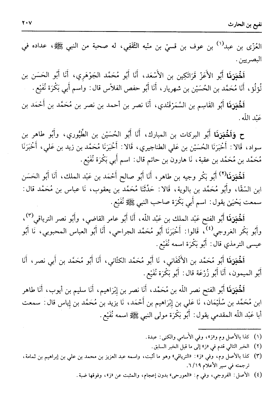 العزى (1) بن عبد بن عوف بن قسي بن منبه الثقفي له صحبة من النبي (صلى الله عليه وسلم) عداده في البصريين أخبرنا أبو الأعز قراتكين بن الأسعد أنا أبو محمد الجوهري أنا أبو الحسن بن لؤلؤ أنا محمد بن الحسين بن شهريار أنا أبو حفص الفلاس قال واسم أبي بكرة نفيع أخبرنا أبو القاسم بن السمرقندي أنا نصر بن احمد بن نصر بن محمد بن أحمد بن عبد الله ح وأخبرنا أبو البركات بن المبارك أنا أبو الحسين بن الطيوري وأبو طاهر بن سواد قالا أخبرنا الحسين بن علي الطناجيري قالا أخبرنا محمد بن زيد بن علي أخبرنا محمد بن محمد بن عقبة نا هارون بن حاتم قال اسم أبي بكرة نفيع أخبرنا (2) أبو بكر وجيه بن طاهر أنا أبو صالح أحمد بن عبد الملك أنا أبو الحسن ابن السقاوأبو محمد بن بالوية قالا حدثنا محمد بن يعقوب نا عباس بن محمد قال سمعت يحيى يقول اسم أبي بكرة صاحب النبي (صلى الله عليه وسلم) نفيع أخبرنا أبو الفتح عبد الملك بن عبد الله أنا أبو عامر القاضي وأبو نصر الترياقي (3) وأبو بكر الغروجي (4) قالوا أخبرنا أبو محمد الجراحي أنا أبو العباس المحبوبي نا أبو عيسى الترمذي قال أبو بكرة اسمه نفيع أخبرنا أبو محمد بن الأكفاني نا أبو محمد الكتاني أنا أبو محمد بن أبي نصر أنا أبو الميمون نا أبو زرعة قال أبو بكرة نفيع أخبرنا أبو الفتح نصر الله بن محمد أنا نصر بن إبراهيم أنا سليم بن أيوب أنا طاهر ابن محمد بن سليمان نا علي بن إبراهيم بن أحمد نا يزيد بن محمد بن إياس قال سمعت أبا عبد الله المقدمي يقول أبو بكرة مولى النبي (صلى الله عليه وسلم) اسمه نفيع