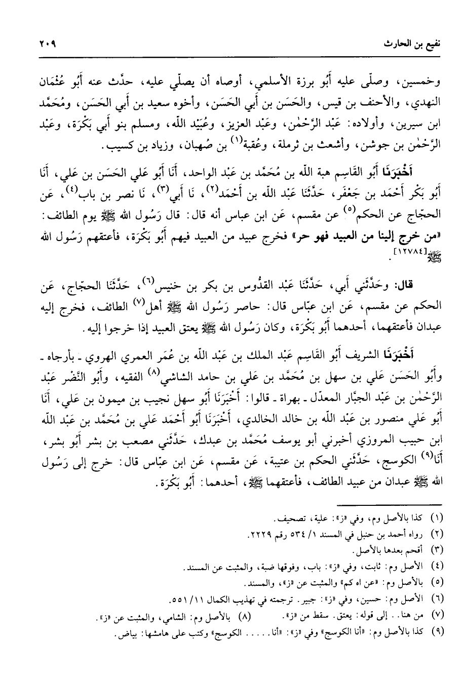 وخمسين وصلى عليه أبو برزة الأسلمي أوصاه أن يصلي عليه حدث عنه أبو عثمان النهدي والأحنف بن قيس والحسن بن أبي الحسن واخوه سعيد بن أبي الحسن ومحمد ابن سيرين وأولاده عبد الرحمن وعبد العزيز وعبيد الله ومسلم بنو أبي بكرة وعبد الرحمن بن جوشن وأشعث بن ثرملة وعقبة (1) بن صهبان وزياد بن كسيب أخبرنا أبو القاسم هبة الله بن محمد بن عبد الواحد أنا أبو علي الحسن بن علي أنا أبو بكر أحمد بن جعفر حدثنا عبد الله بن أحمد (2) نا ابي (3) نا نصر بن باب (4) عن الحجاج عن الحكم (5) عن مقسم عن ابن عباس أنه قال قال رسول الله (صلى الله عليه وسلم) يوم الطائف من خرج إلينا من العبيد فهو حر فخرج عبيد من العبيد فيهم أبو بكرة فأعتقهم رسول الله (صلى الله عليه وسلم) قال وحدثني أبي حدثنا عبد القدوس بن بكر بن خنيس (6) حدثنا الحجاج عن الحكم عن مقسم عن ابن عباس قال حاصر رسول الله (صلى الله عليه وسلم) أهل (7) الطائف فخرج إليه عبدان فأعتقهما أحدهما أبو بكرة وكان رسول الله (صلى الله عليه وسلم) يعتق العبيد إذا خرجوا إليه اخبرنا الشريف أبو القاسم عبد الملك بن عبد الله بن عمر العمري الهروي بأرجاه وابو الحسن علي بن سهل بن محمد بن علي بن حامد الشاشي (8) الفقيه وابو النضر عبد الرحمن بن عبد الجبار المعدل بهراة قالوا أخبرنا أبو سهل نجيب بن ميمون بن علي أنا أبو علي منصور بن عبد الله بن خالد الخالدي أخبرنا أبو أحمد علي بن محمد بن عبد الله ابن حبيب المروزي أخبرني أبو يوسف محمد بن عبدك حدثني مصعب بن بشر أبو بشر أنا (9) الكوسج حدثني الحكم بن عتيبة عن مقسم عن ابن عباس قال خرج إلى رسول الله (صلى الله عليه وسلم) عبدان من عبيد الطائف فأعتقهما (صلى الله عليه وسلم) أحدهما أبو بكرة