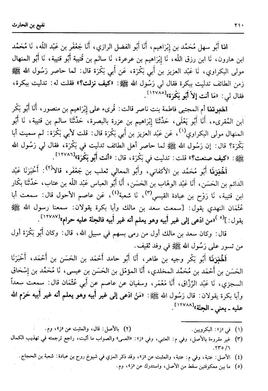 أنا أبو سهل محمد بن إبراهيم أنا أبو الفضل الرازي أنا جعفر بن عبد الله نا محمد ابن هارون نا ابن رزق الله نا إبراهيم بن عرعرة نا سالم بن قتيبة أبو قتيبة نا أبو المنهال مولى البكراوي نا عبد العزيز بن ابي بكرة عن أبي بكرة قال لما حاصر رسول الله (صلى الله عليه وسلم) زمن الطائف تدليت ببكرة فقال لي رسول الله (صلى الله عليه وسلم) كيف نزلت فقلت له تدليت ببكرة فقال لي ما أنت إلا أبو بكرة أخبرتنا أم المجتبى فاطمة بنت ناصر قالت قرئ على إبراهيم بن منصور أنا أبو بكر ابن المقرئ أنا أبو يعلى حدثنا إبراهيم بن عزرة بالبصرة حدثنا سالم بن قتيبة نا أبو المنهال مولى البكراوي (1) عن عبد العزيز بن أبي بكرة قال قلت لأبي بكرة لم سميت أبا بكرة قال إن رسول الله (صلى الله عليه وسلم) لما حاصر أهل الطائف تدليت في بكرة فقال لي رسول الله (صلى الله عليه وسلم) كيف صنعت قلت تدليت في بكرة قال أنت أبو بكرة اخبرنا أبو محمد بن الأكفاني وابو المعالي ثعلب بن جعفر قالا (2) أخبرنا عبد الدائم بن الحسن أنا عبد الوهاب بن الحسن أنا أبو العباس عبد الله بن عتاب حدثنا بكار ابن قتيبة نا روح بن عبادة القيسي (3) نا شعبة (4) عن عاصم الأحول قال سمعت أبا عثمان النهدي يقول سمعت سعد بن مالك وأبا بكرة يقولان سمعنا رسول الله (صلى الله عليه وسلم) يقول (5) من ادعى إلى غير أبيه وهو يعلم أنه غير أبيه فالجنة عليه حرام قال وكان سعد بن مالك أول من رمى بسهم في سبيل الله قال وكان أبو بكرة أول من تسور على رسول الله (صلى الله عليه وسلم) في وفد ثقيف أخبرنا أبو بكر وجيه بن طاهر أنا أبو حامد أحمد بن الحسن بن أحمد أخبرنا الحسن بن احمد بن محمد المخلدي أنا المؤمل بن الحسن بن عيسى نا محمد بن إسحاق السجزي نا عبد الرزاق أنا معمر وسفيان عن عاصم عن أبي عثمان قال سمعت سعدا وأبا بكرة يقولان قال رسول الله (صلى الله عليه وسلم) من ادعى إلى غير أبيه وهو يعلم أنه غير أبيه حرم الله عليه يعني الجنة