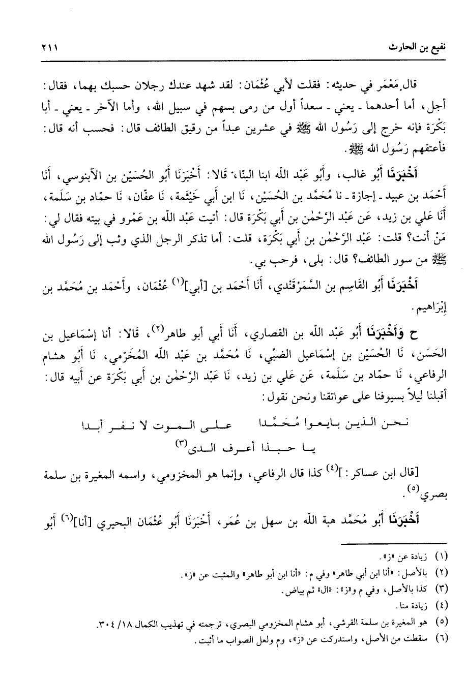 بكرة فإنه خرج إلى رسول الله (صلى الله عليه وسلم) في عشرين عبدا من رقيق الطائف قال فحسب أنه قال فأعتقهم رسول الله (صلى الله عليه وسلم) اخبرنا أبو غالب وأبو عبد الله ابنا البنا قالا أخبرنا أبو الحسين بن الآبنوسي أنا أحمد بن عبيد إجازة نا محمد بن الحسين نا ابن أبي خيثمة نا عفان نا حماد بن سلمة أنا علي بن زيد عن عبد الرحمن بن أبي بكرة قال أتيت عبد الله بن عمرو في بيته فقال لي من أنت قلت عبد الرحمن بن أبي بكرة قلت أما تذكر الرجل الذي وثب إلى رسول الله (صلى الله عليه وسلم) من سور الطائف قال بلى فرحب بي أخبرنا أبو القاسم بن السمرقندي أنا أحمد بن أبي (1) عثمان وأحمد بن محمد بن إبراهيم ح وأخبرنا أبو عبد الله بن القصاري أناابي أبو طاهر (2) قالا أنا إسماعيل بن الحسن نا الحسين بن إسماعيل الضبي نا محمد بن عبد الله المخرمي نا أبو هشام الرفاعي نا حماد بن سلمة عن علي بن زيد نا عبد الرحمن بن أبي بكرة عن أبيه قال أقبلنا ليلا بسيوفنا على عواتقنا ونحن نقول نحن الذين بايعوا محمدا * على الموت لا نفر أبدا يا حبذا أعرف الدى (3) قال ابن عساكر (4) كذا قال الرفاعي وإنما هو المخزومي واسمه المغيرة بن سلمة بصري (5) أخبرنا أبو محمد هبة الله بن سهل بن عمر أخبرنا أبو عثمان البحيري أنا (6) أبو