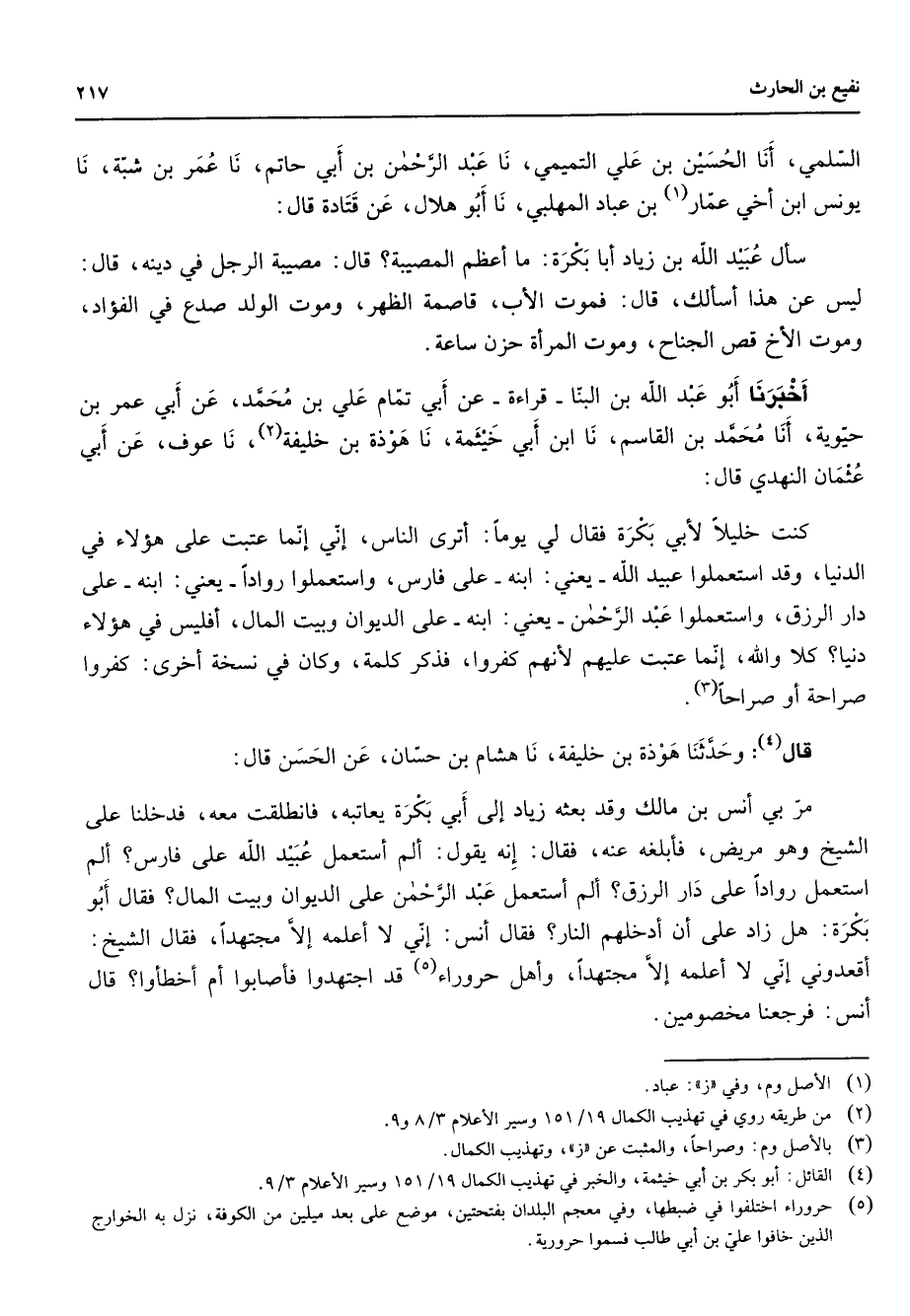 السلمي أن الحسين بن علي التميمي نا عبد الرحمن بن أبي حاتم نا عمر بن شبة نا يونس ابن اخي عمار (1) بن عباد المهلبي نا أبو هلال عن قتادة قال سأل عبيد الله بن زياد أبا بكرة مااعظم المصيبة قال مصيبة الرجل في دينه قال ليس عن هذا أسألك قال فموت الأب قاصمة الظهر وموت الولد صدع في الفؤاد وموت الأخ قص الجناح وموت المرأة حزن ساعة اخبرنا أبو عبد الله بن البنا قراءة عن أبي تمام علي بن محمد عن أبي عمر بن حيوية أنا محمد بن القاسم نا ابن أبي خيثمة نا هوذة بن خليفة (2) نا عوف عن أبي عثمان النهدي قال كنت خليلا لأبي بكرة فقال لي يوما أترى الناس إني إنما عتبت على هؤلاء في الدنيا وقد استعملوا عبيد الله يعني ابنه على فارس واستعملوا روادا يعني ابنه على دار الرزق واستعملوا عبد الرحمن يعني ابنه على الديوان وبيت المال أفليس في هؤلاء دنياكلا والله إنما عتبت عليهم لأنهم كفروا فذكر كلمة وكان في نسخة أخرى كفروا صراحة أو صراحا (3) قال (4) وحدثنا هوذة بن خليفة نا هشام بن حسان عن الحسن قال مر بي أنس بن مالك وقد بعثه زياد إلى أبي بكرة يعاتبه فانطلقت معه فدخلنا على الشيخ وهو مريض فأبلغه عنه فقال إنه يقول ألم أستعمل عبيد الله على فارس ألم استعمل روادا على دار الرزق ألم أستعمل عبد الرحمن على الديوان وبيت المال فقال أبو بكرة هل زاد على أن أدخلهم النار فقال أنس إني لا أعلمه إلا مجتهدا فقال الشيخ أقعدوني إني لا اعلمه إلا مجتهدا وأهل حروراء (5) قد اجتهدوا فأصابوا أم اخطأوا قال أنس فرجعنا مخصومين