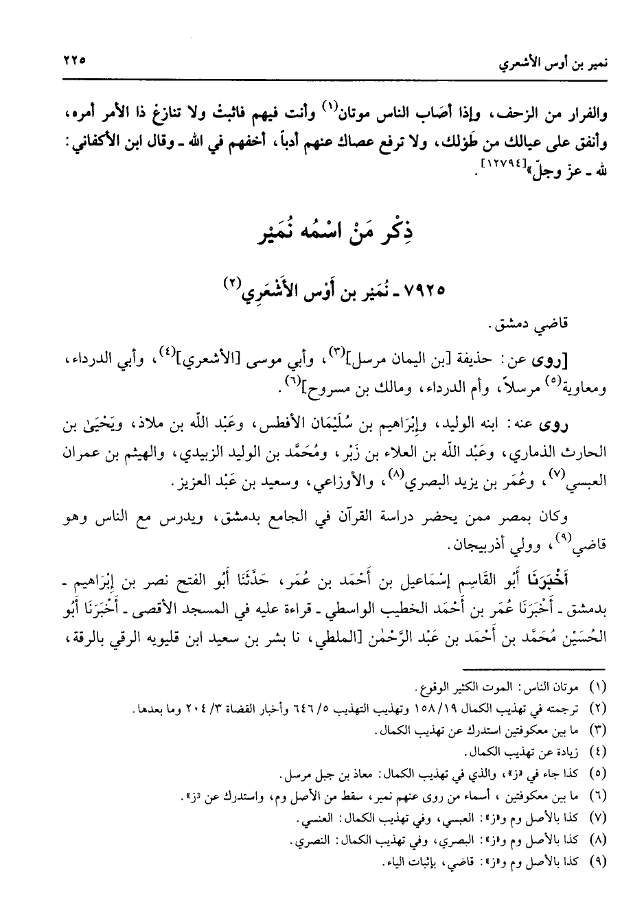 7925 - نمير بن أوس الأشعري (2) قاضي دمشق روى عن حذيفة بن اليمان مرسل (3) وأبي موسى الأشعري (4) وابي الدرداء ومعاوية (5) مرسلا وأم الدرداء ومالك بن مسروح (6) روى عنه ابنه الوليد وإبراهيم بن سليمان الأفطس وعبد الله بن ملاذ ويحيى بن الحارث الذماري وعبد الله بن العلاء بن زبر ومحمد بن الوليد الزبيدي والهيثم بن عمران العبسي (7) وعمر بن يزيد البصري (8) والأوزاعي وسعيد بن عبد العزيز وكان بمصر ممن يحضر دراسة القرآن في الجامع بدمشق ويدرس مع الناس وهو قاضي (9) وولي أذربيجان أخبرنا أبو القاسم إسماعيل بن أحمد بن عمر حدثنا أبو الفتح نصر بن إبراهيم بدمشق أخبرنا عمر بن احمد الخطيب الواسطي قراءة عليه في المسجد الأقصى أخبرنا أبو الحسين محمد بن احمد بن عبد الرحمن الملطي نا بشر بن سعيد ابن قليويه الرقي بالرقة