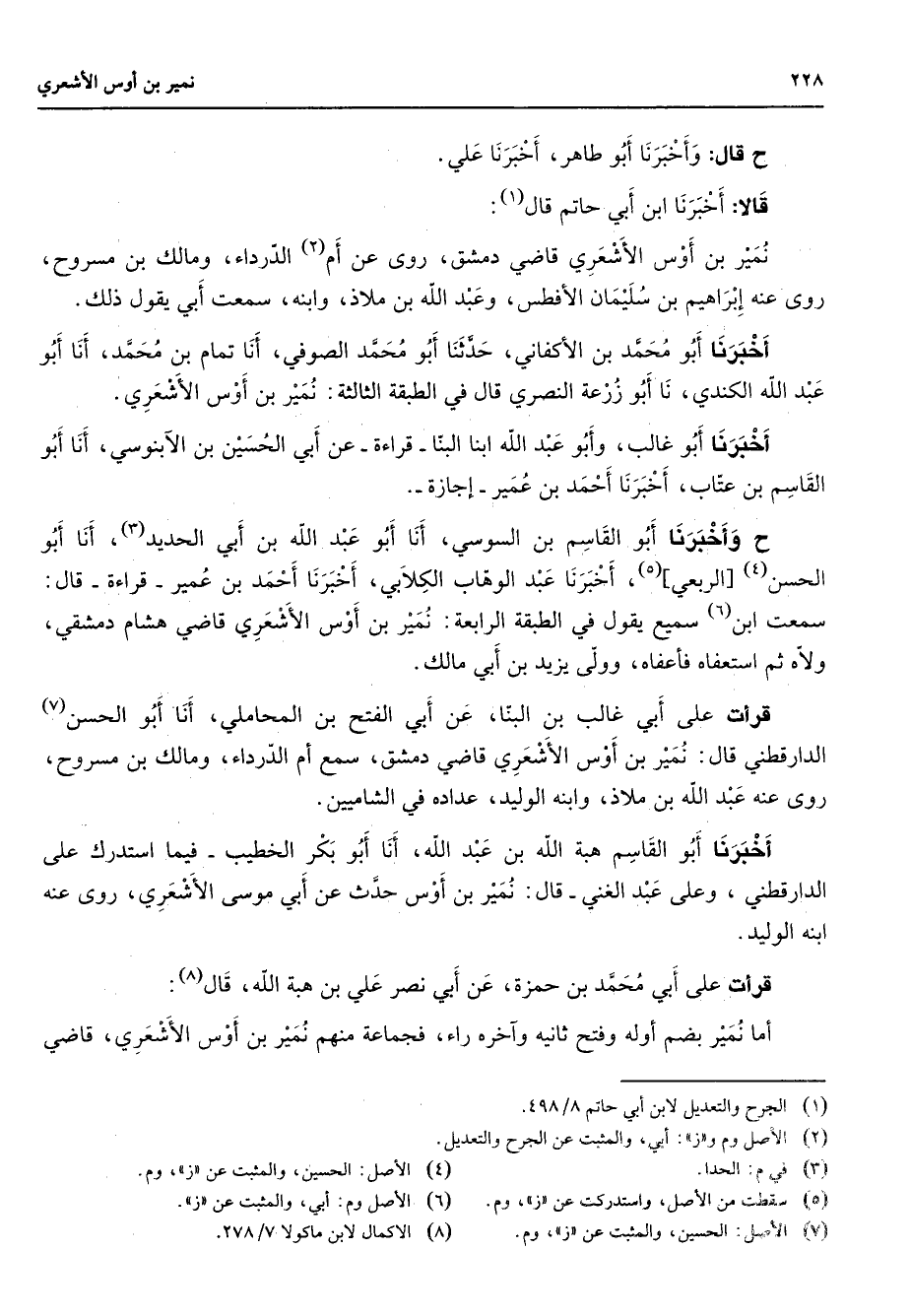ح قال وأخبرنا أبو طاهر أخبرنا علي قالا أخبرنا ابن ابي حاتم قال (1) نمير بن اوس الأشعري قاضي دمشق روى عن أم (2) الدرداء ومالك بن مسروح روى عنه إبراهيم بن سليمان الأفطس وعبد الله بن ملاذ وابنه سمعت أبي يقول ذلك أخبرنا أبو محمد بن الأكفاني حدثنا أبو محمد الصوفي أنا تمام بن محمد أنا أبو عبد الله الكندي نا أبو زرعة النصري قال في الطبقة الثالثة نمير بن أوس الأشعري أخبرنا أبو غالب وأبو عبد الله ابنا البنا قراءة عن أبي الحسين بن الآبنوسي أنا أبو القاسم بن عتاب أخبرنا أحمد بن عمير إجازة ح أخبرنا أبو القاسم بن السوسي أنا أبو عبد الله بن أبي الحديد (3) أنا أبو الحسن (4) الربعي (5) أخبرنا عبد الوهاب الكلابي أخبرنا احمد بن عمير قراءة قال سمعت ابن (6) سميع يقول في الطبقة الرابعة نمير بن أوس الأشعري قاضي هشام دمشقي ولاه ثم استعفاه فأعفاه وولى يزيد بن أبي مالك قرأت على أبي غالب بن البنا عن ابي الفتح بن المحاملي أنا أبو الحسن (7) الدارقطني قال نمير بن أوس الأشعري قاضي دمشق سمع ام الدرداء ومالك بن مسروح روى عنه عبد الله بن ملاذ وابنه الوليد عداده في الشاميين أخبرنا أبو القاسم هبة الله بن عبد الله أنا أبو بكر الخطيب فيما استدرك على الدارقطني وعلى عبد الغني قال نمير بن اوس حدث عن أبي موسى الأشعري روى عنه ابنه الوليد قرأت على أبي محمد بن حمزة عن ابي نصر علي بن هبة الله قال (8) أمانمير بضم أوله وفتح ثانيه وآخره راء فجماعة منهم نمير بن أوس الأشعري قاضي