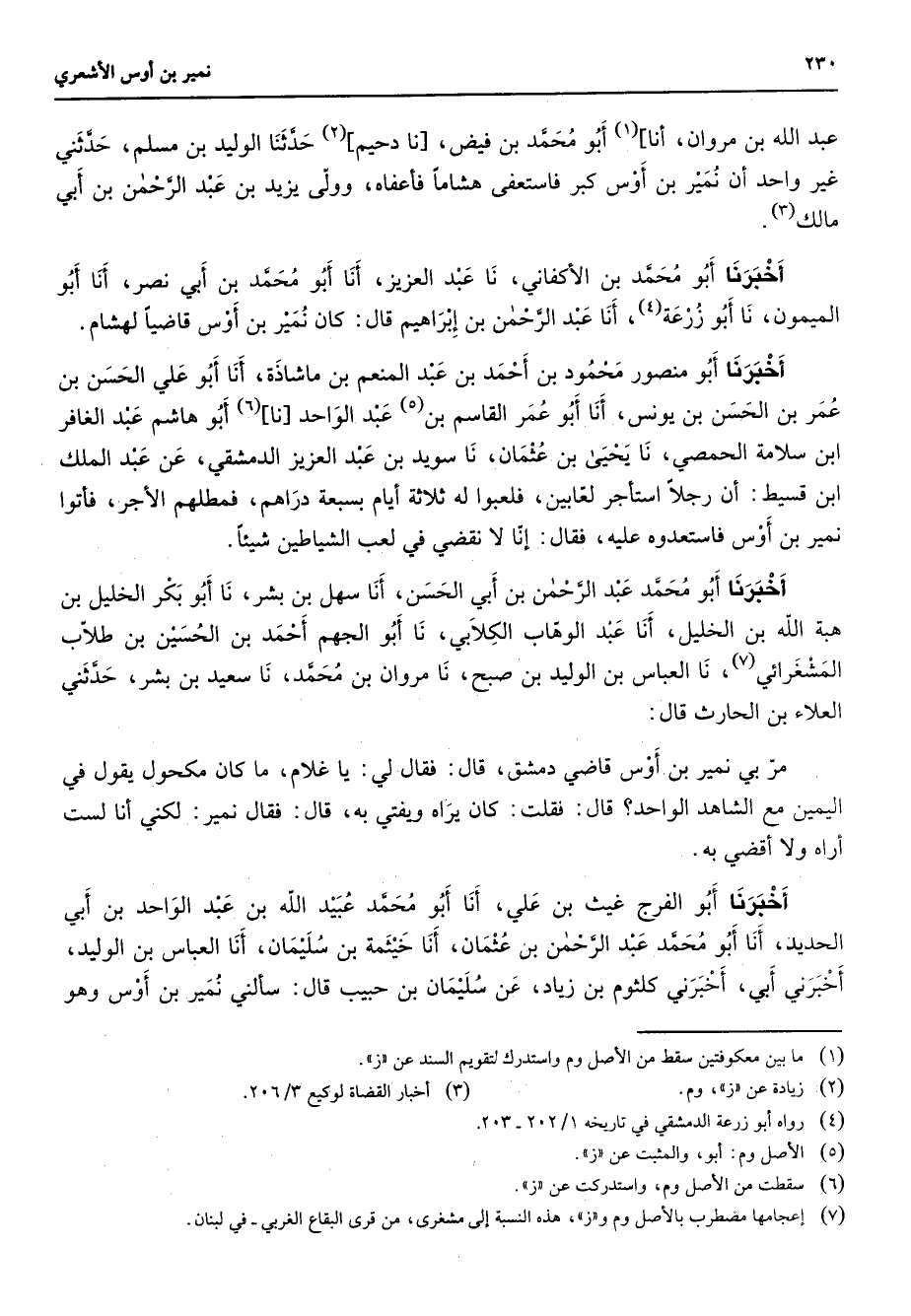 عبد الله بن مروان أنا (1) أبو محمد بن فيض نا دحيم (2) حدثنا الوليد بن مسلم حدثني غير واحد أن نمير بن أوس كبر فاستعفي هشاما فأعفاه وولى يزيد بن عبد الرحمن بن أبي مالك (3) أخبرنا أبو محمد بن الأكفاني نا عبد العزيز أنا أبو محمد بن أبي نصر أنا أبو الميمون نا أبو زرعة (4) أنا عبد الرحمن بن إبراهيم قال كان نمير بن أوس قاضيا لهشام أخبرنا أبو منصور محمود بن أحمد بن عبد المنعم بن ماشاذة أنا أبو علي الحسن بن عمر بن الحسن بن يونس أنا أبو عمر القاسم بن (5) عبد الواحد نا (6) أبو هاشم عبد الغافر ابن سلامه الحمصي نا يحيى بن عثمان نا سويد بن عبد العزيز الدمشقي عن عبد الملك ابن قسيط أن رجلا استأجر لعابين فلعبوا له ثلاثة أيام بسبعة دراهم فمطلهم الأجر فأتوا نمير بن أوس فاستعدوه عليه فقال إنا لا نقضي في لعب الشياطين شيئا أخبرنا أبو محمد عبد الرحمن بن أبي الحسن أنا سهل بن بشر نا أبو بكر الخليل بن هبة الله بن الخليل أنا عبد الوهاب الكلابي نا أبو الجهم أحمد بن الحسين بن طلاب المشغرائي (7) نا العباس بن الوليد بن صبح نا مروان بن محمد نا سعيد بن بشر حدثني العلاء بن الحارث قال مر بي نمير بن أوس قاضي دمشق قال فقال لي يا غلام ما كان مكحول يقول في اليمين مع الشاهد الواحد قال فقلت كان يراه ويفتي به قال فقال نمير لكني انا لست أراه ولا أقضي به أخبرنا أبو الفرج غيث بن علي أنا أبو محمد عبيد الله بن عبد الواحد بن أبي الحديد أنا أبو محمد عبد الرحمن بن عثمان أنا خيثمة بن سليمان أنا العباس بن الوليد أخبرني أبي أخبرني كلثوم بن زياد عن سليمان بن حبيب قال سألني نمير بن أوس وهو