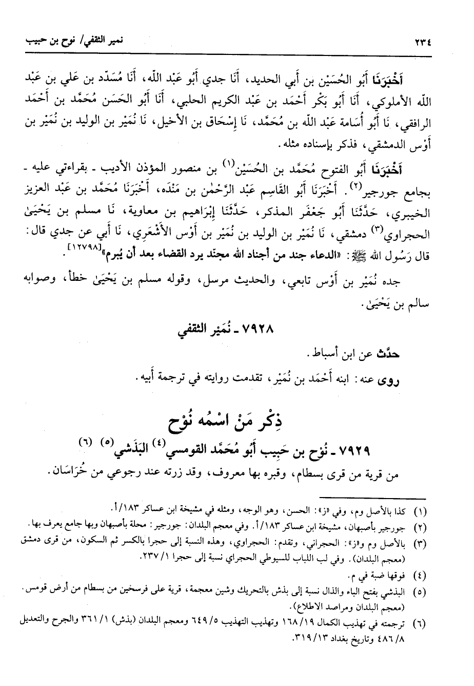 7929 - نوح بن حبيب أبو محمد القومسي (4) البذشي (5) (6) من قرية من قرى بسطام وقبره بها معروف وقد زرته عند رجوعي من خراسان