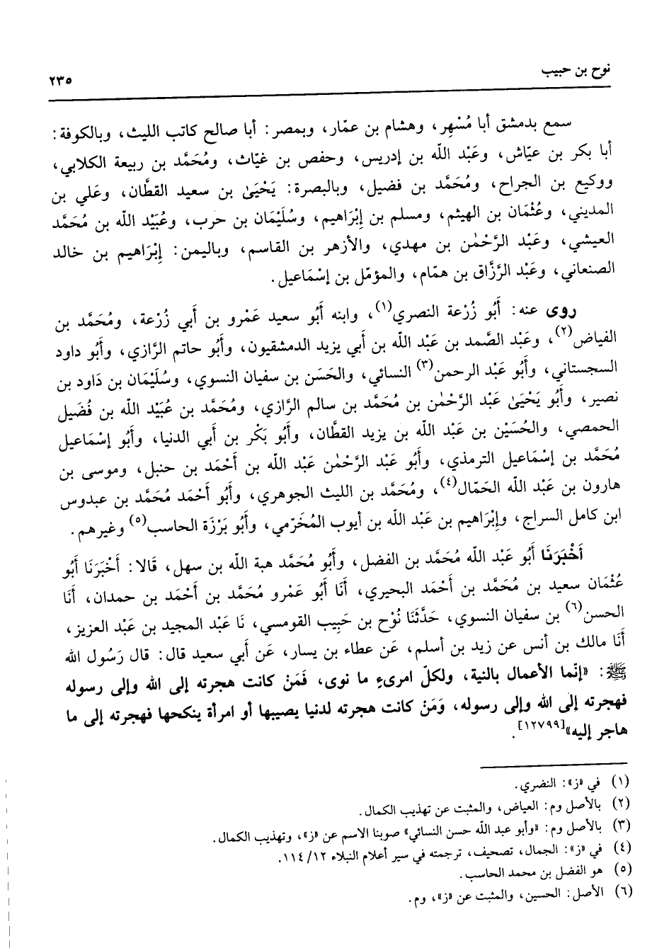 سمع بدمشق أبا مسهر وهشام بن عمار وبمصر أبا صالح كاتب الليث وبالكوفة أبا بكر بن عياش وعبد الله بن إدريس وحفص بن غياث ومحمد بن ربيعة الكلابي ووكيع بن الجراح ومحمد بن فضيل وبالبصرة يحيى بن سعيد القطان وعلي بن المديني وعثمان بن الهيثم ومسلم بن إبراهيم وسليمان بن حرب وعبيد الله بن محمد العيشي وعبد الرحمن بن مهدي والأزهر بن القاسم وباليمن وإبراهيم بن خالد الصنعاني وعبد الرزاق بن همام والمؤمل بن إسماعيل روى عنه أبو زرعة النصري (1) وابنه أبو سعيد عمرو بن أبي زرعة ومحمد بن (2) الفياض وعبد الصمد بن عبد الله بن أبي يزيد الدمشقيون وأبو حاتم الرازي وأبو داود السجستاني وأبو عبد الرحمن (3) النسائي والحسن بن سفيان النسوي وسليمان بن داود بن نصير وابو يحيى عبد الرحمن بن محمد بن سالم الرازي ومحمد بن عبيد الله بن فضيل الحمصي والحسين بن عبد الله بن يزيد القطان وابو بكر بن أبي الدنيا وابو إسماعيل محمد بن إسماعيل الترمذي وأبو عبد الرحمن عبد الله بن احمد بن حنبل وموسى بن هارون بن عبد الله الحمال (4) ومحمد بن الليث الجوهري وأبو أحمد محمد بن عبدوس ابن كامل السراج وإبراهيم بن عبد الله بن أيوب المخرمي وابو برزة (5) الحاسب وغيرهم أخبرنا أبو عبد الله محمد بن الفضل وابو محمد هبة الله بن سهل قالا أخبرنا أبو عثمان سعيد بن محمد بن أحمد البحيري أنا أبو عمرو محمد بن احمد بن حمدان أنا الحسن (6) بن سفيان النسوي حدثنا نوح بن حبيب القومسي نا عبد المجيد بن عبد العزيز أنا مالك بن انس عن زيد بن أسلم عن عطاء بن يسار عن ابي سعيد قال قال رسول الله (صلى الله عليه وسلم) إنما الأعمال بالنية ولكل امرئ ما نوى فمن كانت هجرته إلى الله وإلى رسوله فهجرته إلى الله وإلى رسوله ومن كانت هجرته لدنيا يصيبها أو امرأة ينكحها فهجرته إلى ما هاجر إليه