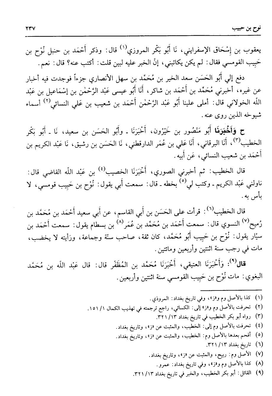 يعقوب بن إسحاق الإسفرايني نا أبو بكر المروزي (1) قال وذكر أحمد بن حنبل نوح بن حبيب القومسي فقال لم يكن يكاتبني إن الخبر عليه لبين قلت أكتب عنه قال نعم دفع إلي أبو الحسن سعد الخير بن محمد بن سهل الأنصاري جزءا فوجدت فيه أخبار عن غيره أخبرني محمد بن احمد بن شاكر أنا أبو عيسى عبد الرحمن بن إسماعيل بن عبد الله الخولاني قال أملى علينا أبو عبد الرحمن أحمد بن شعيب بن علي النسائي (2) أسماء شيوخه الذين روى عنه ح وأخبرنا أبو منصور بن خيرون أخبرنا وأبو الحسن بن سعيد نا أبو بكر الخطيب (3) أنا البرقاني أنا علي بن عمر الدارقطني نا الحسن بن رشيق نا عبد الكريم بن احمد بن شعيب النسائي عن أبيه قال الخطيب ثم اخبرني الصوري أخبرنا الخصيب (4) بن عبد الله القاضي قال ناولني عبد الكريم وكتب لي (5) بخطه قال سمعت أبي يقول نوح بن حبيب قومسي لا بأس به قال الخطيب (6) قرأت على الحسن بن أبي القاسم عن أبي سعيد أحمد بن محمد بن رميح (7) النسوي قال سمعت أحمد بن محمد بن عمر (8) بن بسطام يقول سمعت أحمد بن سيار يقول نوح بن حبيب أبو محمد كان ثقة صاحب سنة وجماعة ورأيته لا يخضب مات في رجب سنة اثنتين وأربعين ومائتين قال (9) وأخبرنا العتيقي أخبرنا محمد بن المظفر قال قال عبد الله بن محمد البغوي مات نوح بن حبيب القومسي سنة اثنتين وأربعين