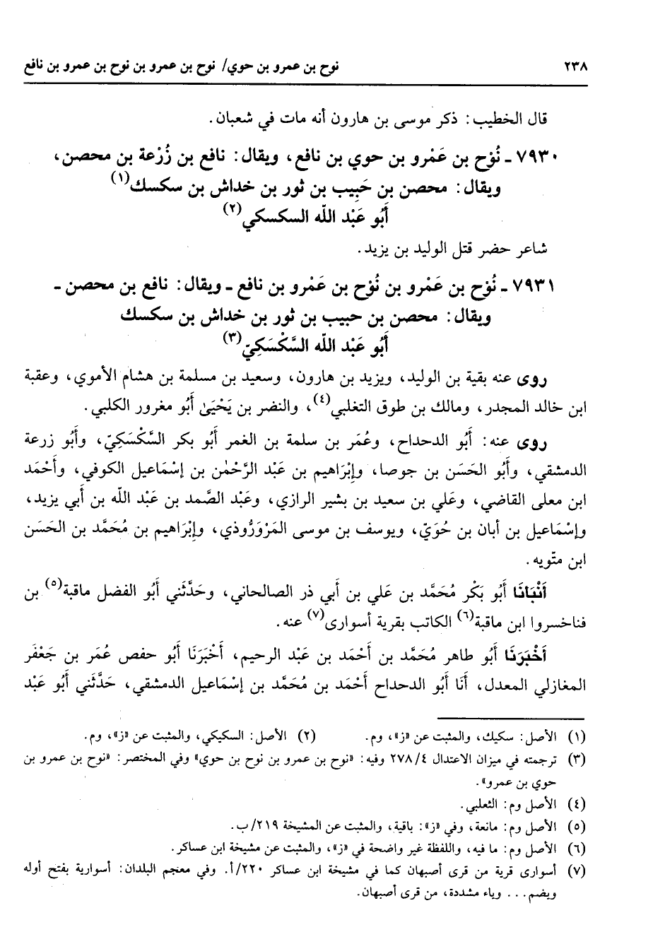 7931 - نوح بن عمرو بن نوح بن عمرو بن نافع ويقال نافع بن محصن ويقال محصن بن حبيب بن ثور بن خداش بن سكسك أبو عبد الله السكسكي (3) روى عنه بقية بن الوليد ويزيد بن هارون وسعيد بن مسلمة بن هشام الأموي وعقبة ابن خالد المجدر ومالك بن طوق التغلبي (4) والنضر بن يحيى أبو مغرور الكلبي روى عنه أبو الدحداح وعمر بن سلمة بن الغمر أبو بكر السكسكي وابو زرعة الدمشقي وأبو الحسن بن جوصا وإبراهيم بن عبد الرحمن بن إسماعيل الكوفي وأحمد ابن معلى القاضي وعلي بن سعيد بن بشير الرازي وعبد الصمد بن عبد الله بن أبي يزيد وإسماعيل بن أبان بن حوي ويوسف بن موسى المروروذي وإبراهيم بن محمد بن الحسن ابن متويه أنبأنا أبو بكر محمد بن علي بن أبي ذر الصالحاني وحدثني أبو الفضل ماقبة (5) بن فناخسروا ابن ماقبة (6) الكاتب بقرية أسواري (7) عنه أخبرنا أبو طاهر محمد بن احمد بن عبد الرحيم أخبرنا أبو حفص عمر بن جعفر المغازلي المعدل أنا أبو الدحداح أحمد بن محمد بن إسماعيل الدمشقي حدثني أبو عبد