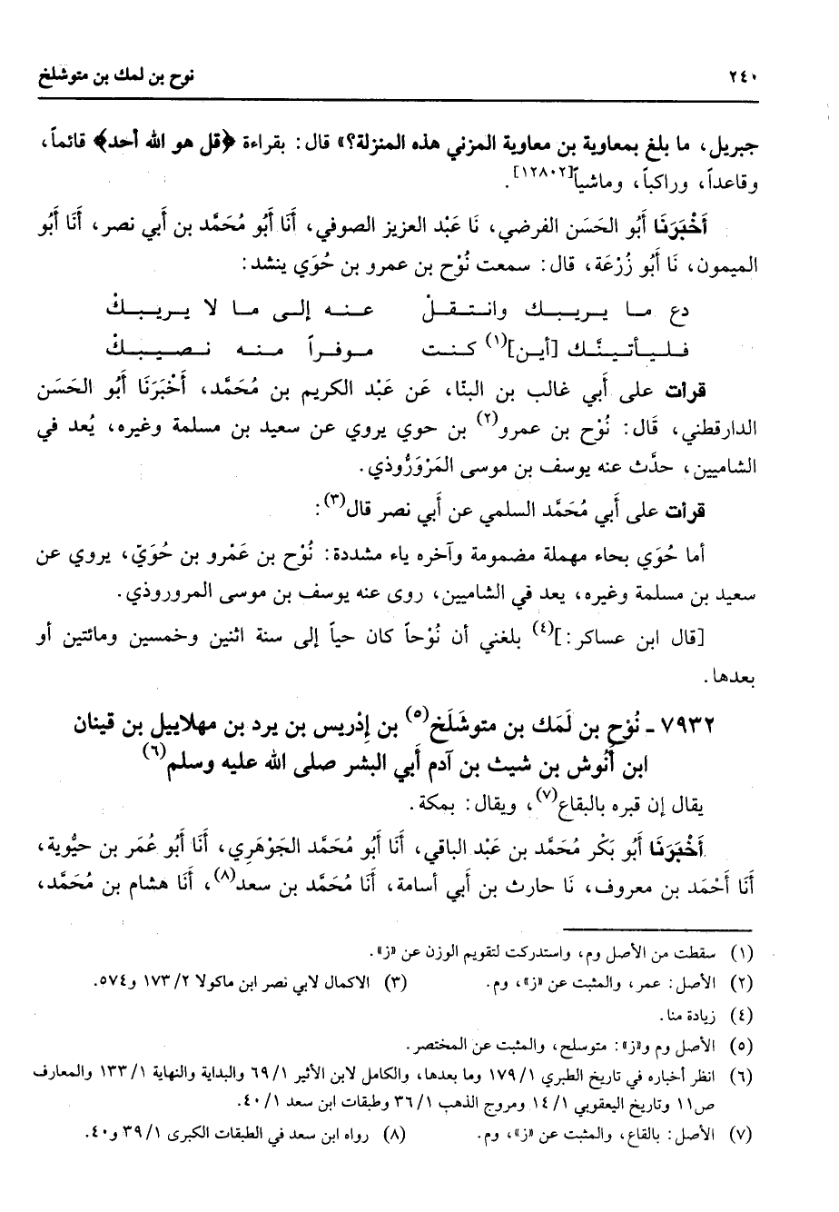 7932 - نوح بن لمك بن متوشلخ (5) بن إدريس بن يرد بن مهلاييل بن قينان ابن أنوش بن شيث بن آدم أبي البشر صلى الله عليه وسلم (6) يقال إن قبره بالبقاع (7) ويقال بمكة أخبرنا أبو بكر محمد بن عبد الباقي أنا أبو محمد الجوهري أنا أبو عمر بن حيوية أنا أحمد بن معروف نا حارث بن أبي أسامة أنا محمد بن سعد (8) أنا هشام بن محمد