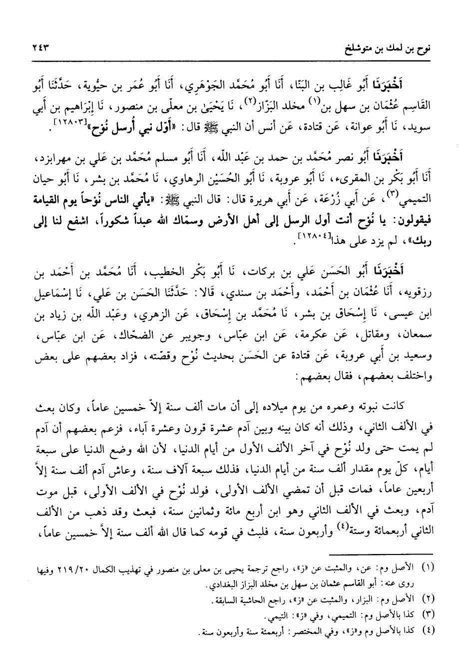 أخبرنا أبو غالب بن البنا أنا أبو محمد الجوهري أنا أبو عمر بن حيوية حدثنا أبو القاسم عثمان بن سهل بن (1) مخلد البزاز (2) نا يحيى بن معلى بن منصور نا إبراهيم بن أبي سويد نا أبو عوانة عن قتادة عن أنس أن النبي (صلى الله عليه وسلم) قال أول نبي أرسل نوح أخبرنا أبو نصر محمد بن حمد بن عبد الله أنا أبو مسلم محمد بن علي بن مهرابزد أناابوبكر بن المقرئ نا أبو عروبة نا أبو الحسين الرهاوى نا محمد بن بشر نا أبو حيان التميمي (3) عن أبي زرعة عن أبي هريرة قال قال النبي (صلى الله عليه وسلم) يأتي الناس نوحا يوم القيامة فيقولون يا نوح أنت أول الرسل إلى أهل الأرض وسماك الله عبدا شكورا اشفع لنا إلى ربك لم يزد على هذا أخبرنا أبو الحسن علي بن بركات نا أبو بكر الخطيب أنا محمد بن أحمد بن رزقويه أنا عثمان بن احمد وأحمد بن سندي قالا حدثنا الحسن بن علي نا إسماعيل ابن عيسى نا إسحاق بن بشر نا محمد بن إسحاق عن الزهري وعبد الله بن زياد بن سمعان ومقاتل عن عكرمة عن ابن عباس وجويبر عن الضحاك عن ابن عباس وسعيد بن ابي عروبة عن قتادة عن الحسن بحديث نوح وقصته فزاد بعضهم على بعض واختلف بعضهم فقال بعضهم كانت نبوته وعمره من يوم ميلاده إلى أن مات ألف سنة إلا خمسين عاما وكان بعث في الألف الثاني وذلك أنه كان بينه وبين آدم عشرة قرون وعشرة آباء فزعم بعضهم أن آدم لم يمت حتى ولد نوح في آخر الألف الأول من أيام الدنيا لأن الله وضع الدنيا على سبعة أيام كل يوم مقدار ألف سنة من أيام الدنيا فذلك سبعة آلاف سنة وعاش آدم ألف سنة إلا أربعين عاما فمات قبل أن تمضي الألف الأولى فولد نوح في الألف الأولى قبل موت آدم وبعث في الألف الثاني وهو ابن أربع مائة وثمانين سنة فبعث وقد ذهب من الألف الثاني أربعمائة (4) وستة وأربعون سنة فلبث في قومه كما قال الله ألف سنة إلا خمسين عاما