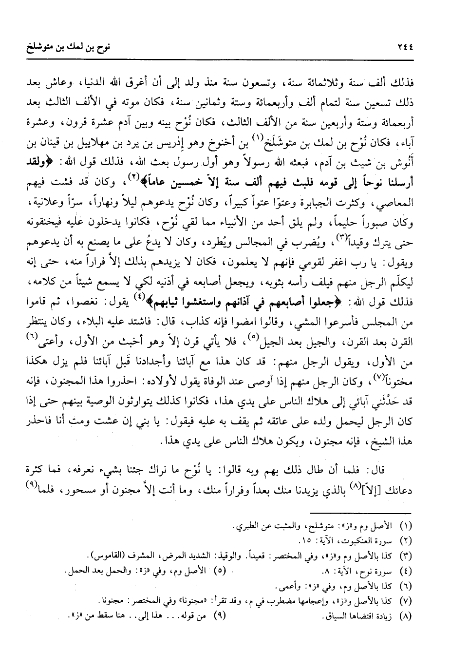 فذلك ألف سنة وثلاثمائة سنة وتسعون سنة منذ ولد إلى أن أغرق الله الدنيا وعاش بعد ذلك تسعين سنة لتمام ألف وأربعمائة وستة وثمانين سنة فكان موته في الألف الثالث بعد أربعمائة وستة وأربعين سنة من الألف الثالث فكان نوح بينه وبين آدم عشرة قرون وعشرة آباء فكان نوح بن لمك بن متوشلخ (1) بن أخنوخ وهو إدريس بن يرد بن مهلاييل بن قينان بن أنوش بن شيث بن آدم فبعثه الله رسولا وهو أول رسول بعث الله فذلك قول الله " ولقد أرسلنا نوحا إلى قومه فلبث فيهم ألف سنة إلا خمسين عاما " (2) وكان قد فشت فيهم المعاصي وكثرت الجبابرة وعتواعتوا كبيرا وكان نوح يدعوهم ليلا ونهارا سرا وعلانية وكان صبورا حليما ولم يلق أحد من الأنبياء مما لقي نوح فكانوا يدخلون عليه فيخنقونه حتى يترك وقيدا (3) ويضرب في المجالس ويطرد وكان لا يدع على ما يصنع به ان يدعوهم ويقول با رب اغفر لقومي فإنهم لا يعلمون فكان لا يزيدهم بذلك إلا فرارا منه حتى إنه ليكلم الرجل منهم فيلف رأسه بثوبه ويجعل أصابعه في أذنيه لكي لا يسمع شيئا من كلامه فذلك قول الله " جعلوا أصابعهم في آذانهم واستغشوا ثيابهم " (4) يقول نغصوا ثم قاموا من المجلس فأسرعوا المشي وقالوا امضوا فإنه كذاب قال فاشتد عليه البلاء وكان ينتظر القرن بعد القرن والجيل بعد الجيل (5) فلا يأتي قرن إلا وهو أخبث من الأول وأعتى (6) من الأول ويقول الرجل منهم قد كان هذا مع آبائنا وأجدادنا قبل آبائنا فلم يزل هكذا (7) مختونا وكان الرجل منهم إذا اوصى عند الوفاة يقول لأولاده احذروا هذا المجنون فإنه قد حدثني آبائي إلى هلاك الناس على يدي هذا فكانوا كذلك يتوارثون الوصية بينهم حتى إذا كان الرجل ليحمل ولده على عاتقه ثم يقف به عليه فيقول يا بني إن عشت ومت أنا فاحذر هذا الشيخ فإنه مجنون ويكون هلاك الناس على يدي هذا قال فلما أن طال ذلك بهم وبه قالوا يا نوح ما نراك جئنا بشئ نعرفه فما كثرة دعائك إلا (8) بالذي يزيدنا منك بعدا وفرارا منك وما أنت إلا مجنون أو مسحور فلما (9)