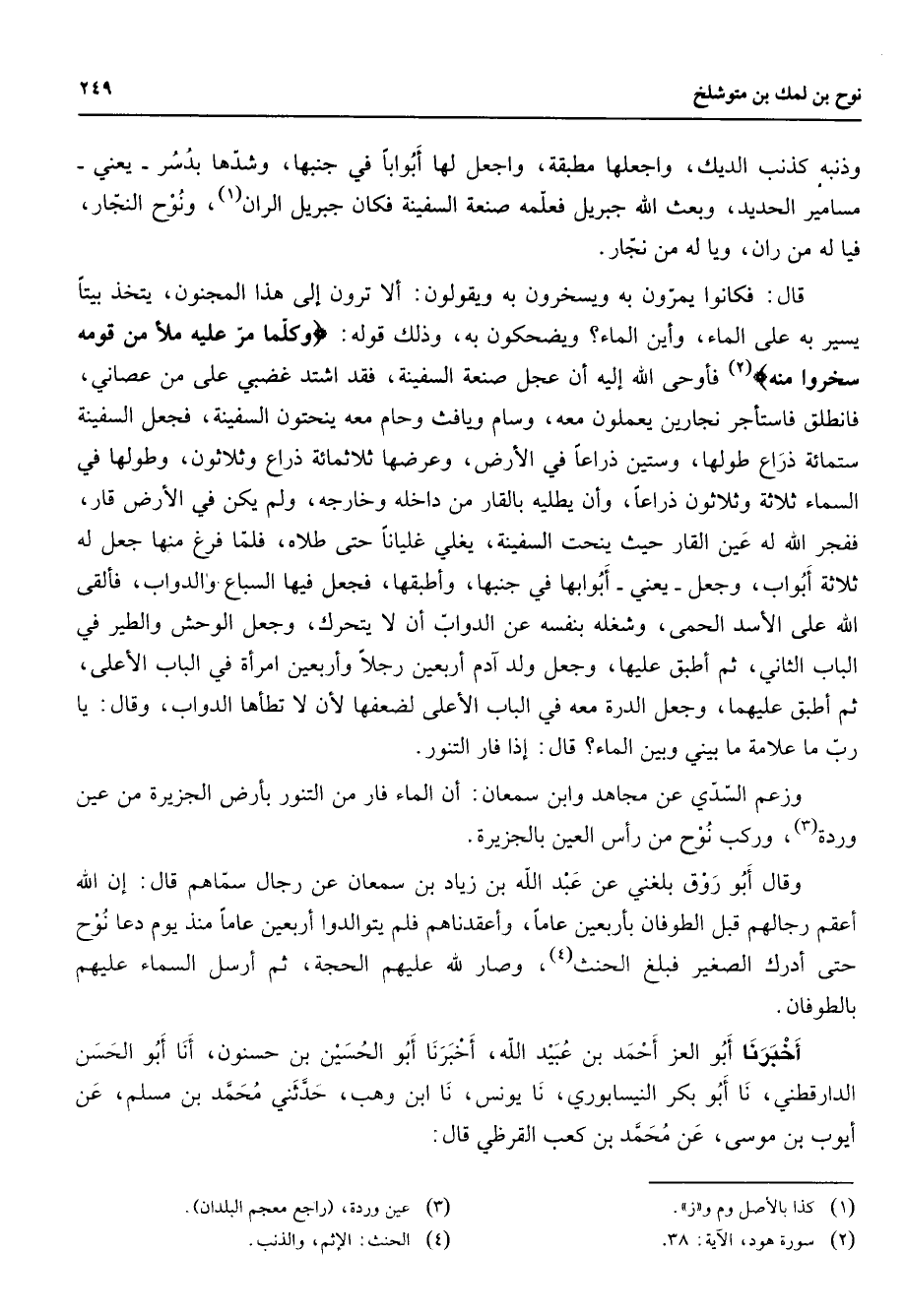 وذنبه كذنب الديك واجعلها مطبقة واجعل لها أبوابا في جنبها وشدها بدسر يعني مسامير الحديد وبعث الله جبريل فعلمه صنعة السفينة فكان جبريل الران (1) ونوح النجار فياله من ران ويا له من نجار قال فكانوا يمرون به ويسخرون به ويقولون ألا ترون إلى هذا المجنون يتخذ بيتا يسير به على الماء وأين الماء ويضحكون به وذلك قوله " وكلما مر عليه ملأ من قومه سخروا (2) منه " فأوحى الله إليه ان عجل صنعة السفينة فقد اشتد غضبي على من عصاني فانطلق فاستأجر نجارين يعملو معه وسام ويافث وحام معه ينحتون السفينة فجعل السفينة ستمائة ذراع طولها وستين ذراعا في الأرض وعرضها ثلاثمائة ذراع وثلاثون وطولها في السماء ثلاثة وثلاثون ذراعا وأن يطليه بالقار من داخله وخارجه ولم يكن في الأرض قار ففجرالله له عين القار حيث ينحت السفينة يغلي غليانا حتى طلاه فلما فرغ منها جعل له ثلاثة أبواب وجعل يعني أبوابها في جنبها وأطبقها فجعل فيها السباع والدواب فألقى الله على الأسد الحمى وشغله بنفسه عن الدواب أن لا يتحرك وجعل الوحش والطير في الباب الثاني ثم اطبق عليها وجعل ولد آدم أربعين رجلا وأربعين امراة في الباب الأعلى ثم أطبق عليهما وجعل الدرة معه في الباب الأعلى لضعفها لأن لا تطأها الدواب وقال يا رب ما علامة ما بيني وبين الماء قال إذا فار التنور وزعم السدي عن مجاهد وابن سمعان أن الماء فار من التنور بأرض الجزيرة من عين وردة (3) وركب نوح من رأس العين بالجزيرة وقال أبو روق بلغني عن عبد الله بن زياد بن سمعان عن رجال سماهم قال إن الله أعقم رجالهم قبل الطوفان بأربعين عاما وأعقدناهم فلم يتوالدوا أربعين عاما منذ يوم دعا نوح حتى ادرك الصغير فبلغ الحنث (4) وصار لله عليهم الحجة ثم ارسل السماء عليهم بالطوفان أخبرنا أبو العز أحمد بن عبيد الله أخبرنا أبو الحسين بن حسنون أنا أبو الحسن الدارقطني نا أبو بكر النيسابوري نا يونس نا ابن وهب حدثني محمد بن مسلم عن أيوب بن موسى عن محمد بن كعب القرظي قال