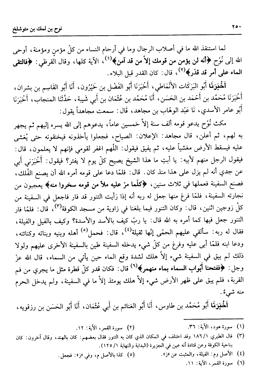 لما استنقذ الله ما في أصلاب الرجال وما في أرحام النساء من كل مؤمن ومؤمنة أوحى الله إلى نوح " أنه لن يؤمن من قومك إلا من قد آمن (1) " الآية كلها وقال القرضي " فالتقى الماء على أمر قد قدر (2) " قال كان القدر قبل البلاء أخبرنا أبو البركات الأنماطي أخبرنا أبو الفضل بن خيرون أنا أبو القاسم بن بشران أخبرنا محمد بن أحمد بن الحسن أنا محمد بن عثمان بن أبي شيبة حدثنا المنجاب أخبرنا أبو عامر الأسدي نا عبد الوهاب بن مجاهد قال سمعت مجاهدا يقول مكث نوح يدعو قومه الف سنة إلا خمسين عاما يدعوهم إلى الله يسره إليهم ثم يجهر به لهم ثم أعلن قال مجاهد الإعلان الصياح فجعلوا يأخذونه فيخنقونه حتى يغشى عليه فيسقط الأرض مغشيا عليه ثم يفيق فيقول اللهم اغفر لقومي فإنهم لا يعلمون قال فيقول الرجل منهم لأبيه يا أبت ما هذا الشيخ يصيح كل يوم لا يفتر فيقول أخبرني أبي عن جدي أنه لم يزل على هذا منذ كان قال فلما دعا على قومه أمره الله أن يصنع الفلك فصنع السفينة فعملها في ثلاث سنين " كلما مر عليه ملأ من قومه سخروا منه " يعجبون من نجارته السفينة فلما فرغ منها جعل له ربه انه إذا رأيت التنور قد فار فاجعل في السفينة من كل زوجين اثنين قال وكان التنور فيما بلغنا في زواية من مسجد الكوفة (3) قال فلما فار التنور جعل فيها كما أمره به الله قال يا رب كيف بالأسد والأسدة وكيف بالفيل والفيلة فقال له ربه سألقي عليهم الحمى إنها ثقيلة (4) قال فحمل (5) أهله وبنيه وبناته وكنائنه ودعا ابنه فلما أبى عليه وفرغ من كل شئ يدخله السفينة طين بالسفينة الأخرى عليهم ولولا ذلك لم يبق في السفينة شئ إلا هلك لشدة وقع الماء حين يأتي من السماء قال الله عز وجل " ففتحنا أبواب السماء بماء منهمر (6) " قال فكان قدر كل قطرة مثل ما يجري من فم القربة فلم يبق على ظهر الأرض شئ إلا هلك يومئذ إلا ما في السفينة ولم يدخل الحرم منه شئ أخبرنا أبو محمد بن طاوس أنا أبو الغنائم بن أبي عثمان أنا أبو الحسن بن رزقويه