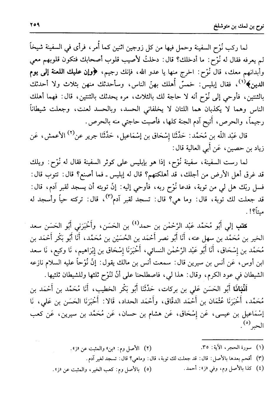 لما ركب نوح السفينة وحمل فيها من كل زوجين اثنين كما أمر فرأى في السفينة شيخا لم يعرفه فقال له نوح ما أدخلك قال دخلت لأصيب قلوب أصحابك فتكون قلوبهم معي وأبدانهم معك قال نوح اخرج منها يا عدو الله فإنك رجيم " وإن عليك اللعنة إلى يوم الدين (1) " فقال إبليس خمس أهلك بهن الناس وسأحدثك منهن بثلاث ولا احدثك بالثنتين فأوحى إلى نوح أنه لا حاجة لك بالثلاث مره يحدثك بالثنتين قال فهما أهلك الناس وهما لا يكذبان هما اللتان لا يخلفاني الحسد وبالحسد لعنت وجعلت شيطانا رجيما والحرص أتيح آدم الجنة كلها فأصبت حاجتي منه بالحرص قال عبد الله بن محمد حدثنا إسحاق بن إسماعيل حدثنا جرير عن (2) الأعمش عن زياد بن حصين عن أبي العالية قال لما رست السفينة سفينة نوح إذا هو بإبليس على كوثر السفينة فقال له نوح ويلك قد غرق أهل الأرض من أجلك قد اهلكتهم قال له إبليس فما أصنع قال تتوب قال فسل ربك هل لي من توبة فدعا نوح ربه فأوحي إليه إن توبته أن يسجد لقبر آدم قال قد جعلت لك توبة قال وما هي قال تسجد لقبر آدم (3) قال تركته حيا وأسجد له ميتا كتب إلي أبو محمد عبد الرحمن بن حمد (4) بن الحسن وأخبرني أبو الحسن سعد الخير بن محمد بن سهل عنه أنا أبو نصر أحمد بن الحسين بن محمد أنا أبو بكر أحمد بن محمد بن إسحاق أنا أبو عبد الرحمن النسائي أخبرنا إسحاق بن إبراهيم نا وكيع نا سعد ابن أوس عن أنس بن سيرين قال سمعت أنس بن مالك يقول إن نوحا عليه السلام نازعه الشيطان في عود الكرم وقال هذا لي فاصطلحنا على أن لنوح ثلثها وللشيطان ثلثيها أنبأنا أبو الحسن علي بن بركات حدثنا أبو بكر الخطيب أنا محمد بن أحمد بن محمد أخبرنا عثمان بن احمد الدقاق وأحمد الحداد قالا أخبرنا الحسن بن علي نا إسماعيل بن عيسى عن إسحاق عن هشام بن حسان عن محمد بن سيرين عن كعب الحبر (5)