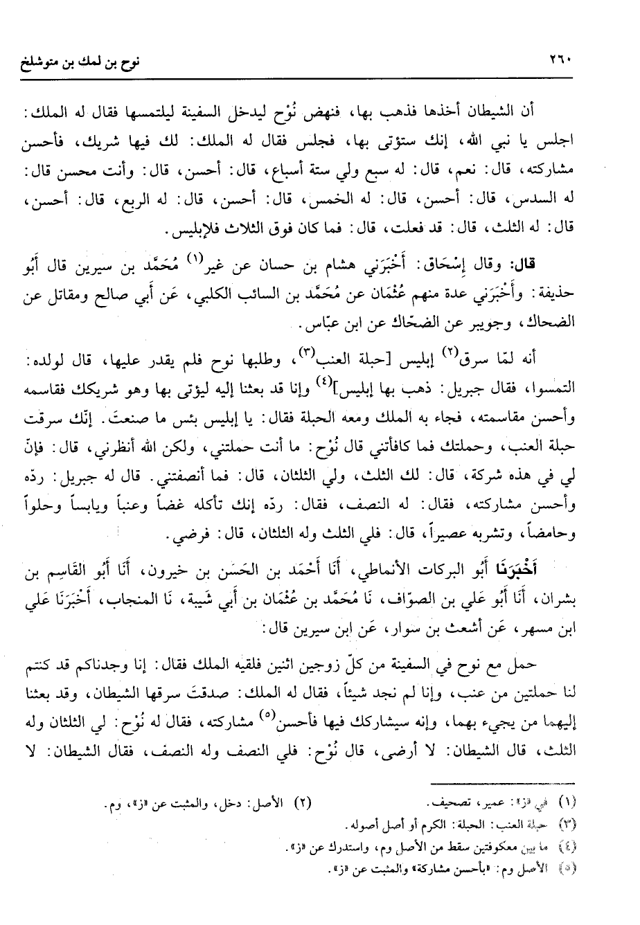 أن الشيطان أخذها فذهب بها فنهض نوح ليدخل السفينة ليلتمسها فقال له الملك اجلس يا نبي الله إنك ستؤتى بها فجلس فقال له الملك لك فيها شريك فأحسن مشاركته قال نعم قال له سبع ولي ستة أسباع قال أحسن قال وأنت محسن قال له السدس قال أحسن قال له الخمس قال احسن قال له الربع قال أحسن قال له الثلث قال قد فعلت قال فما كان فوق الثلاث فلإبليس قال وقال إسحاق أخبرني هشام بن حسان عن غير (1) محمد بن سيرين قال أبو حذيفة وأخبرني عدة منهم عثمان عن محمد بن السائب الكلبي عن أبي صالح ومقاتل عن الضحاك وجويبر عن الضحاك عن ابن عباس أنه لما سرق (2) إبليس حبلة العنب (3) وطلبها نوح فلم يقدر عليها قال لولده التمسوا فقال جبريل ذهب بها (4) إبليس وإنا قد بعثنا إليه ليؤتى بها وهو شريكك فقاسمه وأحسن مقاسمته فجاء به الملك ومعه الحبلة فقال يا إبليس بئس ما صنعت إنك سرقت حبلة العنب وحملتك فما كافأتني قال نوح ما أنت حملتني ولكن الله أنظرني قال فإن لي في هذه شركة قال لك الثلث ولي الثلثان قال فما أنصفتني قال له جبريل رده وأحسن مشاركته فقال له النصف فقال رده إنك تأكله غضا وعنبا ويابسا وحلوا وحامضا وتشربه عصيرا قال فله الثلث وله الثلثان قال فرضي أخبرنا أبو البركات الأنماطي أنا احمد بن الحسن بن خيرون أنا أبو القاسم بن بشران أنا أبو علي بن الصواف نا محمد بن عثمان بن أبي شيبة نا المنجاب أخبرنا علي ابن مسهر عن أشعث بن سوار عن ابن سيرين قال حمل مع نوح في السفينة من كل زوجين اثنين فلقيه الملك فقال إنا وجدناكم قد كنتم لناحملتين من عنب وإنا لم نجد شيئا فقال له الملك صدقت سرقها الشيطان وقد بعثنا إليهما من يجئ بهما وإنه سيشاركك فيها فأحسن (5) مشاركته فقال له نوح لي الثلثان وله الثلث قال الشيطان لا أرضى قال نوح فلي النصف وله النصف فقال الشيطان لا